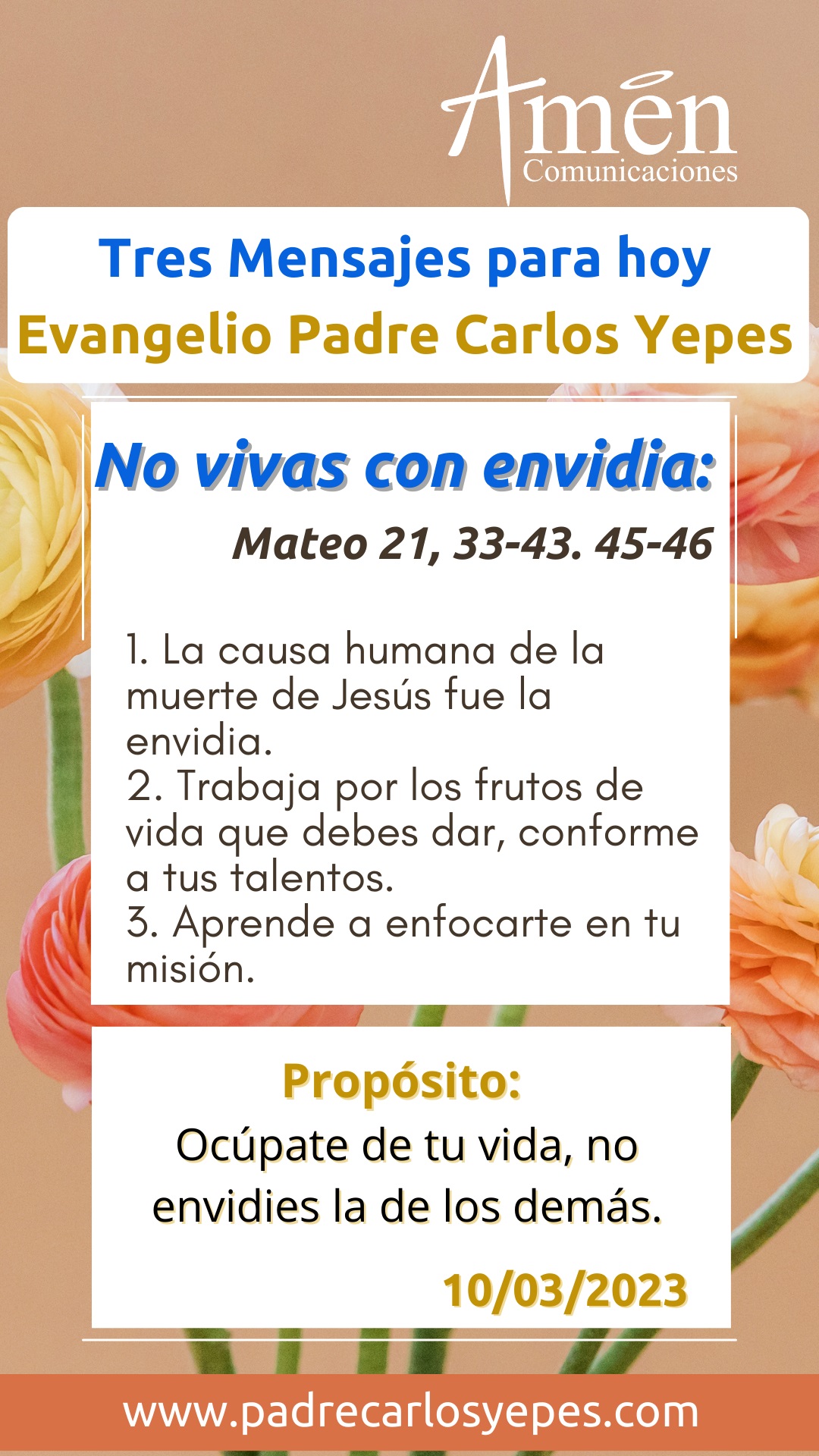 Hoy reconozcamos como dice el evangelista Mateo, “La piedra que desecharon los arquitectos, es ahora la piedra angular que sostiene el edificio de la vida” y hoy reconozcamos también, que la vida por ser trabajadores en la viña del Señor, nos lleva a dar frutos. Te pregunto ¿Si hoy murieras, tus frutos son abundantes para entregarle al Señor dueño de la viña? ¿hay frutos de justicia, hay frutos de amor, frutos de servicio en tu vida? o, por el contrario, ¿hay frutos amargos, no hay uvas sino agrazones, uvas amargas, de envidias, ambiciones, egoísmos, rencores, orgullos, codicias humanas? Piénsalo, la vida no es tan larga y hoy a partir de este texto evangélico, aprende a no envidiar a nadie y aprende a dar frutos como lo pide el Señor.