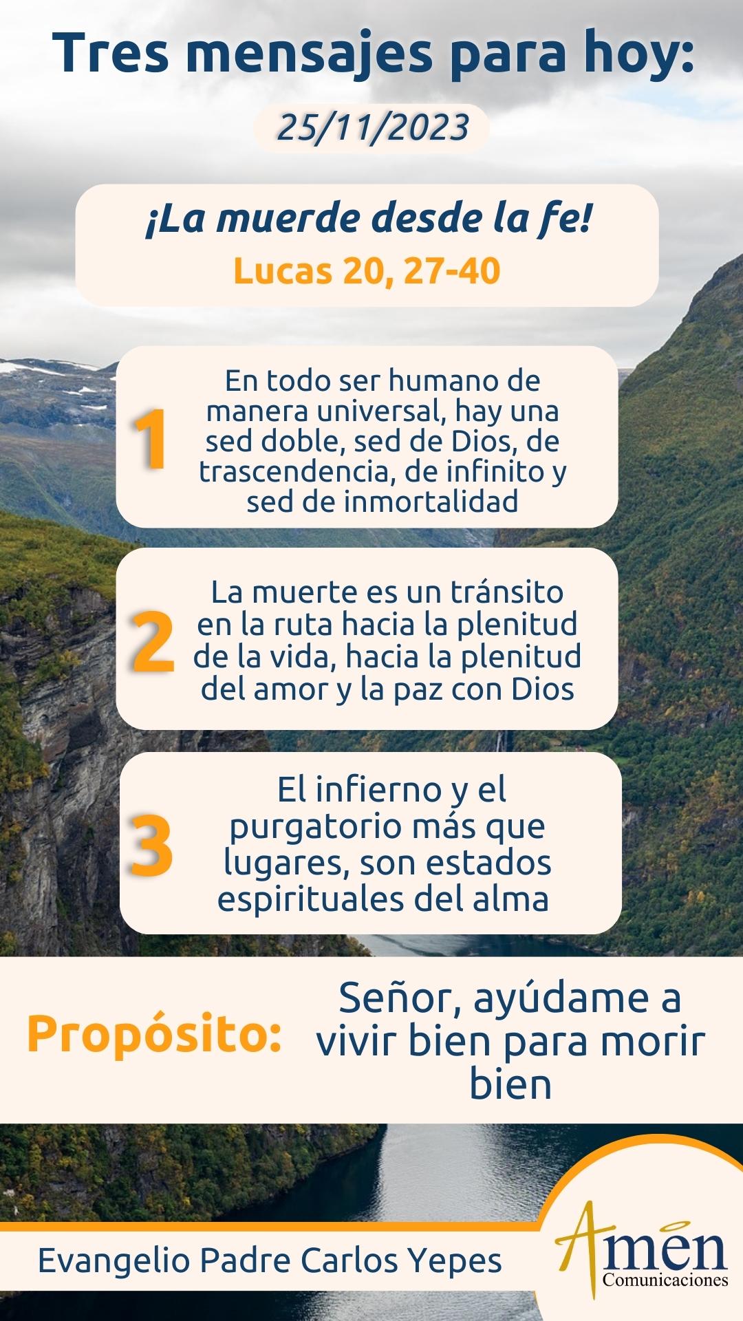 Hoy frente a nuestros fieles difuntos, por los que oramos con más intensidad en este mes de noviembre, agradezcamos sus bondades, los favores, la sabiduría, la vida que nos dieron. Oremos por esos seres difuntos fallecidos, oremos pidiendo perdón y misericordia por sus pecados, y reflexionemos desde ellos nuestra misma muerte, que nos lleve a vivir bien para morir bien. Pero además del purgatorio y además del infierno, está el cielo, donde hablamos de aquellos que triunfaron, donde el único partido de su vida que no podían perder lo ganaron y gozan de la gloria eterna de Dios; viven en la plenitud de Dios y han asumido con heroísmo la fe, esto es, la confianza en Dios en medio de grandes pruebas, han asumido con heroísmo la esperanza, esperar en Dios contra toda esperanza y sobre todo, han asumido con heroísmo el amor, no dejaron de amar, ni se cansaron de amar, más allá de ingratitudes, traiciones y soledades.