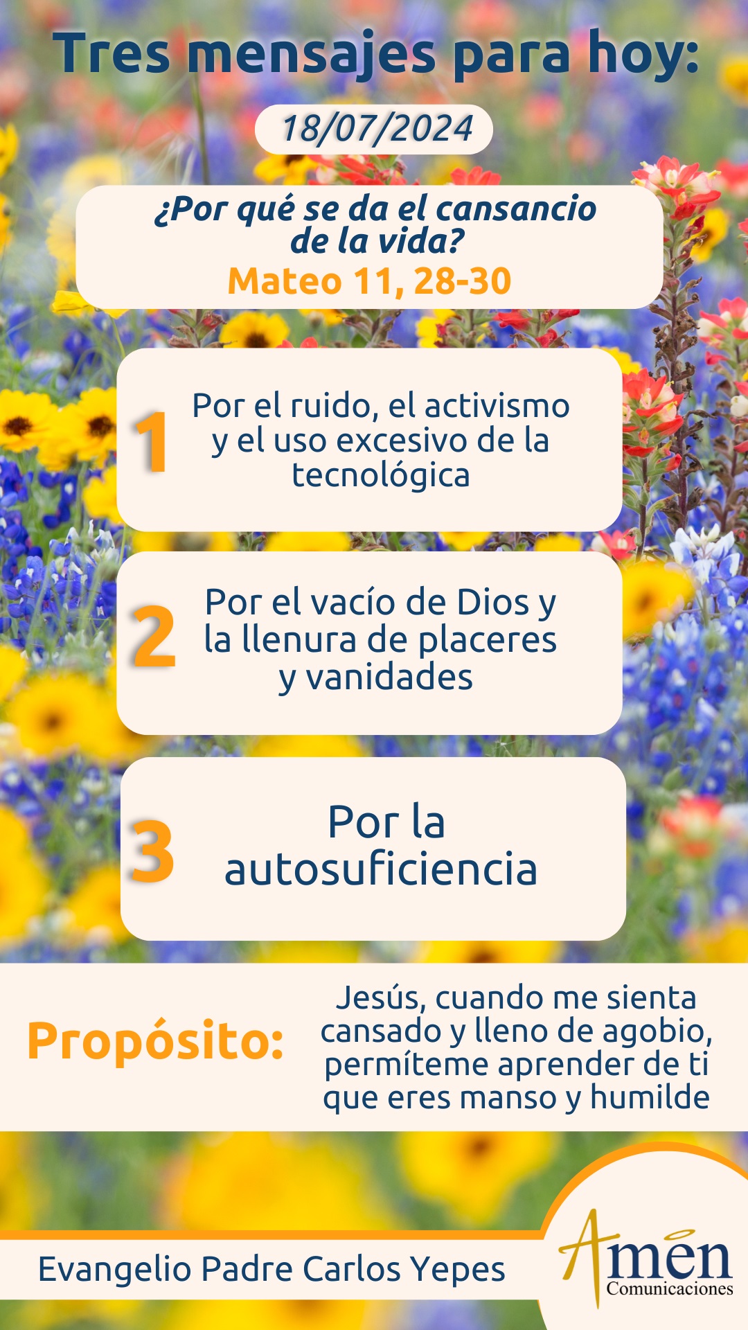 Pero hoy, preguntémonos 2000 años después, si Jesús veía agobios y cansancios en los hombres y mujeres de su tiempo, hoy nos preguntamos, si más allá de la tecnología, del avance científico, del bienestar material, de la calidad y nivel de vida material que hemos alcanzado en el siglo XXI, los hombres y mujeres de nuestro tiempo, vivimos de una manera más descansada. La respuesta seguramente es no. Hoy hay un cansancio profundo de la vida y nos preguntamos ¿a qué se debe? y podríamos encontrar varias respuestas. El cansancio del hombre no es necesariamente físico, orgánico o material, aunque también lo hay; el cansancio del hombre no es sólo emocional, anímico o mental, aunque también lo hay. El cansancio del hombre de hoy, es sobre todo un cansancio de la vida, que se manifiesta como rutina, como hastío, como desencanto de los sueños que tenía frente a su vida.