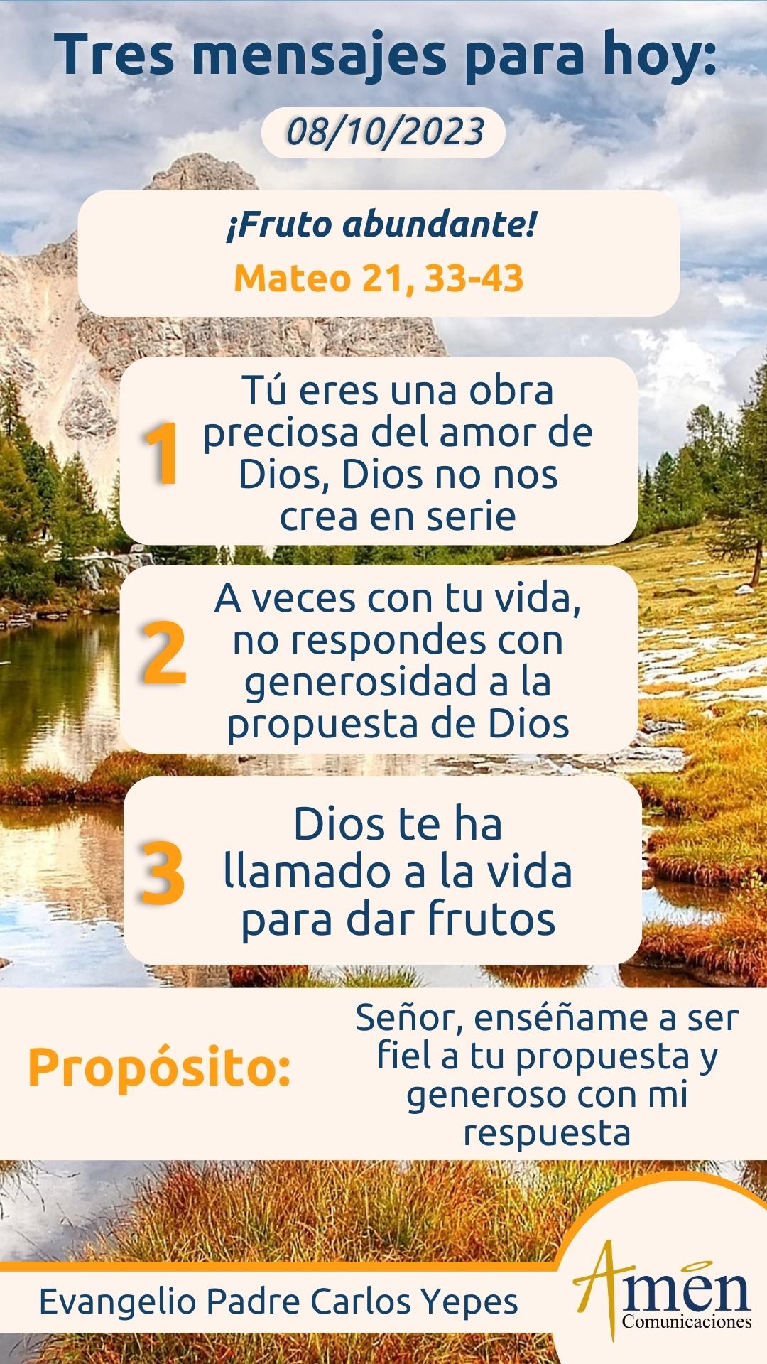Señor, gracias por este evangelio, gracias por permitirme descubrir que con tanto amor has cultivado mi vida, que quizás no he dado los frutos esperados y que al final de mi existencia, con lo único que me presentaré ante ti en la vida eterna, es con el amor y los frutos de justicia y misericordia, que haya entregado a los demás.