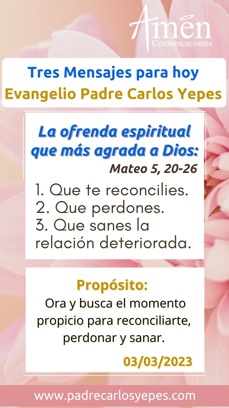 Recordarlo, estamos en cuaresma caminando hacia la Pascua y todos estos evangelios y estas lecturas de los profetas, nos invitan a tomarnos en serio nuestra conversión, no se trata como los fariseos de mucho cumplimiento (cumplo y miento) con ritos externos, con oraciones que salen de los labios, pero no del corazón, sino que se trata de una verdadera conversión, cambio de vida desde lo más profundo del ser. ¿Te cuesta? no te preocupes, pídele a Dios y Él te dará la humildad, la misericordia, la capacidad para perdonar aquél con el que te has peleado.
