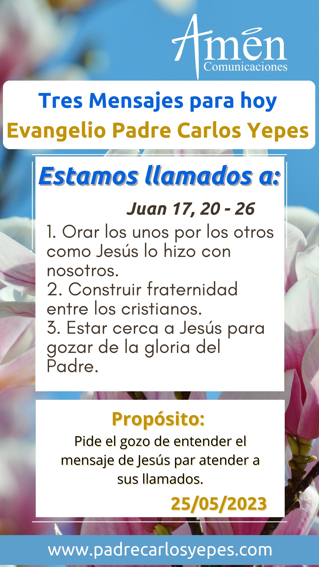 Pero pasemos ahora al evangelio, que nos invita a contemplar esta oración sacerdotal de Jesús que hemos venido meditando en los últimos días, y vemos como Jesús, ora no sólo por sus discípulos, sino por los discípulos de sus discípulos, por aquellos que crean en la palabra predicada, en el anuncio con unción, que hagan sus discípulos después de su muerte. En el fondo, Jesús nos dice que está orando por nosotros, los hombres y mujeres del siglo 21, porque nosotros somos fruto de la predicación de los discípulos de otros discípulos y otros discípulos y otros discípulos, y así sucesivamente, hasta llegar, hasta los discípulos apóstoles de Jesús.