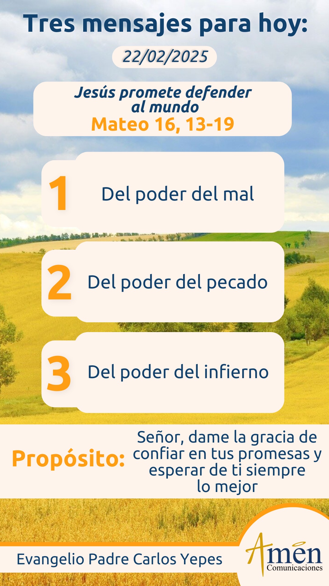 No pienses que el egoísmo, la autosuficiencia, el odio, la violencia, la emulación y las envidias, la codicia de tener bienes y el afán de atesorar, tendrán al final la victoria sobre la sociedad y el mundo; sino que creemos en esta promesa de Jesús: “El poder del mal, el poder del pecado, el poder del infierno no derrotará al mundo, ni a la Iglesia, que es fermento de un nuevo mundo, una nueva sociedad”.
