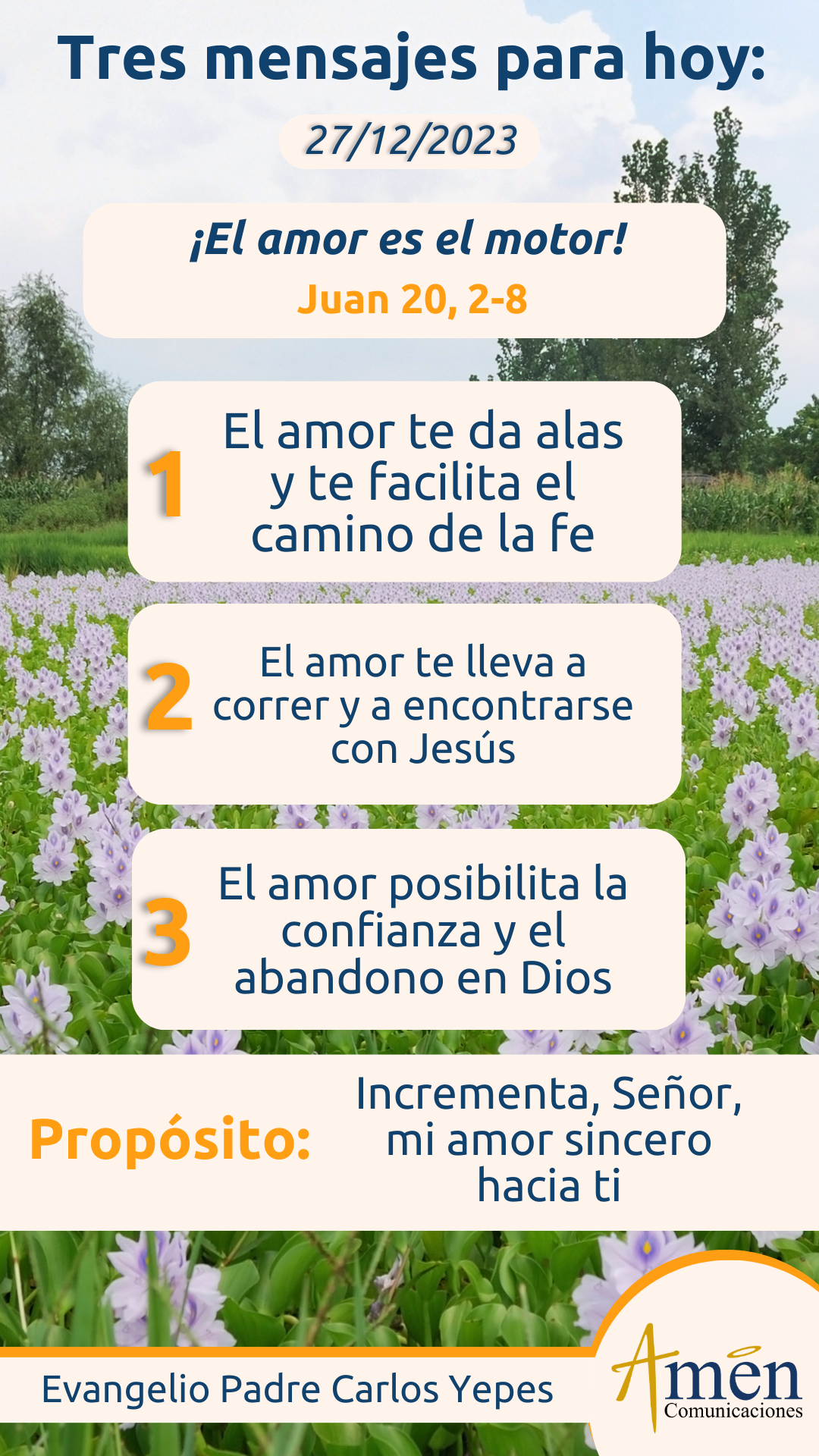 TRANSLITERACIÓN REFLEXIÓN PADRE CARLOS YEPES Estamos en la llamada octava de Navidad, los ocho días que siguen a la gran solemnidad del nacimiento de Jesús para la humanidad entera, y si tenemos fe, un nacimiento en nuestro corazón que nos llevará a mirar la existencia con nuevos ojos. No deja de ser impresionante, el mensaje de la primera carta del apóstol san Juan, cuando él reconoce que aquel que existía desde el principio, al que le hemos oído sus palabras, al que lo hemos visto con nuestros propios ojos, en su caminar, en su rostro, en sus ademanes y gestualidad, al que hemos contemplado y han palpado nuestras manos la palabra de vida, de ese queremos hablar, de ese queremos dar testimonio y hacer anuncio. Y dirá el apóstol san Juan en la primera lectura de hoy, tomada precisamente de su primera carta en el capítulo 1, como es precisamente ese anuncio fuente de alegría completa para cualquier vida humana; él quiere anunciar la vida de Jesús, para que todos estemos unidos a san Juan, como el apóstol estuvo unido a Cristo y éste unido al Padre Dios. Y es que hablar de Juan, más allá de ser un apóstol o evangelista, es hablar del discípulo más amado por Jesús, del más joven de todos ellos, pero sobre todo del místico, del hombre lleno del Espíritu Santo, que voló alto, muy alto, en el conocimiento y la experiencia del amor de Cristo, a tal punto que se le simboliza a lo largo de dos mil años de la iglesia con el águila, porque las águilas vuelan alto en las montañas, y Juan voló alto en la experiencia del amor de Dios. Hoy alegrémonos como dice el salmo: “Alégrense justos con el Señor, porque el Señor reina, la tierra goza, la justicia y el derecho sostienen su trono, los cielos pregonan su justicia y los pueblos contemplan su gloria”. Y nos dirá el salmo de hoy: “Amanece la luz para el hombre justo y la alegría para los rectos de corazón, alégrense justos con el Señor, celebren su santo nombre”. Pero pasamos al evangelio, que nos muestra como María Magdalena corre donde los apóstoles y les anuncia que la tumba donde habían colocado el cuerpo yerto de Jesús está vacía. Los apóstoles, impactados, salen del recinto donde se encontraban y corren, pero dice precisamente el evangelio de san Juan, que corre Pedro, y hablando de sí mismo corre Juan, y como era más joven llega más rápido, pero también otros autores dicen, porque su amor era más grande llegó primero a la tumba antes que el apóstol Pedro. Es que el amor nos da alas y nos facilita el camino de la fe, fue el amor de María Magdalena, que la llevó a buscar en la madrugada de ese domingo primero de la semana a Jesús, a llevarle algunas especies, según las costumbres funerarias de la época, y es el amor de Juan, el que le lleva a correr y a encontrarse con Él. Pero este amor no se da de manera gratuita y en vida de Jesús, sabemos que Juan era de ese trío privilegiado con su hermano Santiago y el apóstol Pedro, que fueron testigos de excepción, por encima de los otros discípulos luego apóstoles, de la gloria de Jesús en el monte Tabor de la Transfiguración. Juan también fue testigo de excepción, de la agonía de Jesús en el Calvario y sobre todo fue testigo único de excepción en el grupo de los apóstoles, de la muerte de Jesús y de las palabras finales antes de partir de este mundo, cuando le entrega a María como Madre espiritual no solamente para él, sino para toda la humanidad. Por eso hablar de san Juan, no es hablar de un apóstol más en el grupo de los 12, sino hablar de aquel, que en su primera, segunda y tercera carta, en su evangelio y en el libro del Apocalipsis, nos muestra, la profunda experiencia que tiene del amor de Dios. De hecho, el evangelio de san Juan es completamente distinto de los llamados evangelios sinópticos, de Mateo, Marcos y Lucas; Juan siempre contrapone, de alguna manera buscando la comparación, la sinopsis, Jesús con los judíos, lo nuevo y lo viejo, la letra de la ley y el espíritu de la ley, la luz y las tinieblas, la fe y la incredulidad, los discípulos de la iglesia y la sinagoga judía. Siempre san Juan planteará este conflicto radical e irreconciliable mostrando, o somos de Jesús o estamos contra Jesús. Hoy pidamos ese fuego de este joven apóstol, el único que acompañó a Jesús hasta el final de su vida, arriesgando su existencia y estando con Él al pie de la cruz, y también el único apóstol que no muere mártir. En efecto según la tradición, morirá en la isla de Patmos en el mar Mediterráneo, allí, a través de un amanuense o secretario, escribirá el famoso libro de las Revelaciones o Apocalipsis (el último texto de la Sagrada Escritura). Pero Juan fue también, el depositario por la confianza que Jesús tuvo en él, para cuidar a María cuando se desata esa terrible persecución en la ciudad de Jerusalén, y la lleva a vivir a un precioso lugar en Éfeso, muy cerca de la costa de Kusadasi la actual Turquía, en el mar Mediterráneo. Allí en Éfeso, la Virgen partirá al encuentro con Dios y Juan tuvo el privilegio de tener muy cercanamente después de san José, a los dos grandes tesoros de la fe cristiana católica, Jesús Redentor y su Madre Santísima, asociada de manera privilegiada a su obra de redención. San Juan evangelista, san Juan apóstol, san Juan amigo fiel de Jesús, san Juan místico, intercede, intercede por nosotros. Que el Señor te bendiga abundantemente en este día, en el nombre del Padre, y del Hijo y del Espíritu Santo. Amén.