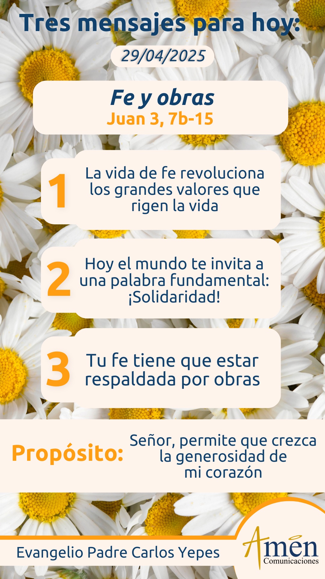 una quimera, un ideal imaginario, creo que nuestro mundo nos invita a una palabra fundamental, ¡solidaridad! No te niegues esa alegría de sacar del ahorro, de lo que crees necesario para tu vida y darle a ese familiar, a ese vecino, a esa señora sola, a esa persona necesitada. Nuestra fe no puede ser solo discursos bellos, reflexiones que nos conmueven hasta las lágrimas; “nuestra fe tiene que estar respaldada por obras”, (como dice el apóstol Santiago).