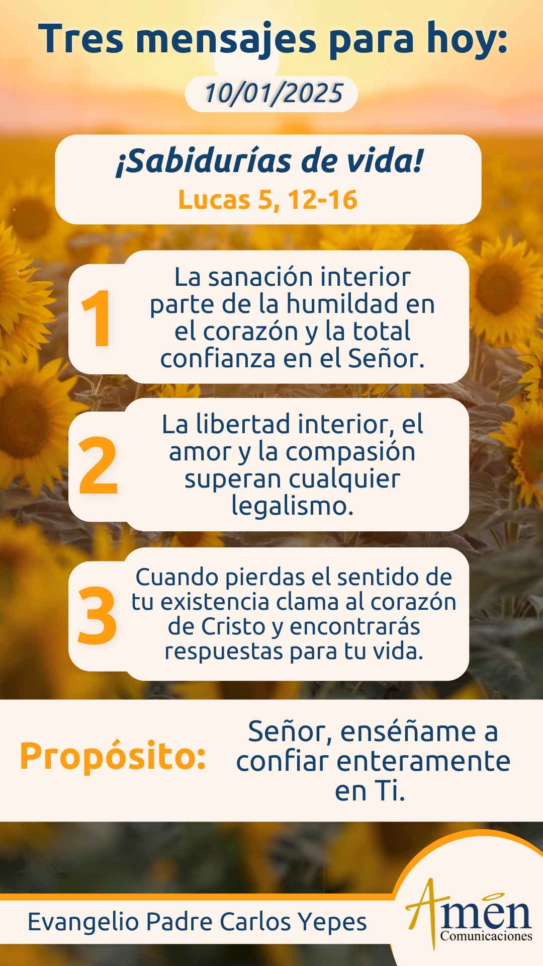 El primero, la humildad de corazón del leproso y la total confianza de él en Jesús, cuando el evangelio nos dice: “Que el hombre enfermo se postró, se puso rostro en tierra ante Jesús y le rogó, si tú quieres, si es tu voluntad, puedes sanarme, puedes limpiarme”. Que esa humildad de corazón y esa total confianza en el Señor, sea un distintivo en nuestra vida a la hora de buscar ser sanados interiormente.