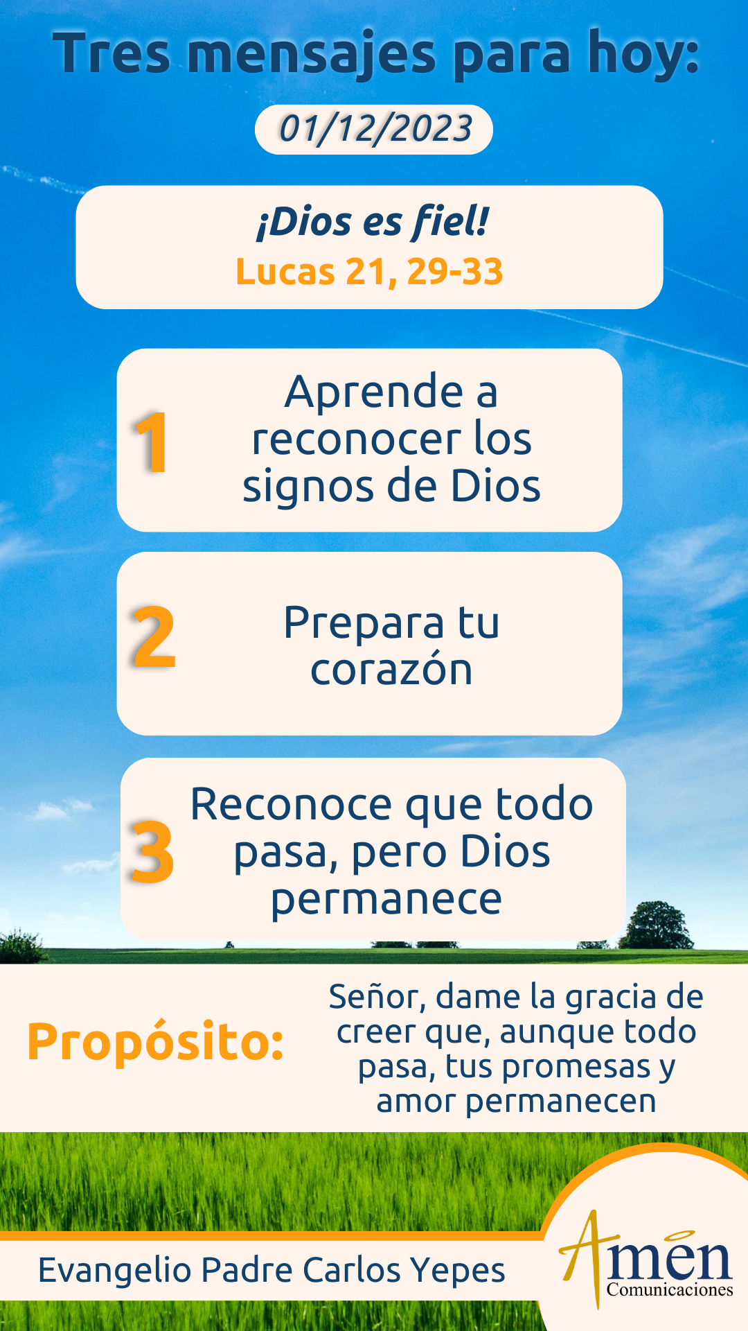Hoy te invito para que con una mirada de fe y espiritual, reconozcas los signos y señales, las huellas y mensajes, que Dios coloca no solamente en la vida del mundo, sino en tu vida familiar y en tu vida personal: ¿te invita a la paciencia?, ¿te invita a la vigilancia?, ¿te invita al perdón?, ¿te invita a poner todo en orden en tu casa interior o en la casa de tu hogar?, reconoce la acción de Dios en tu vida.