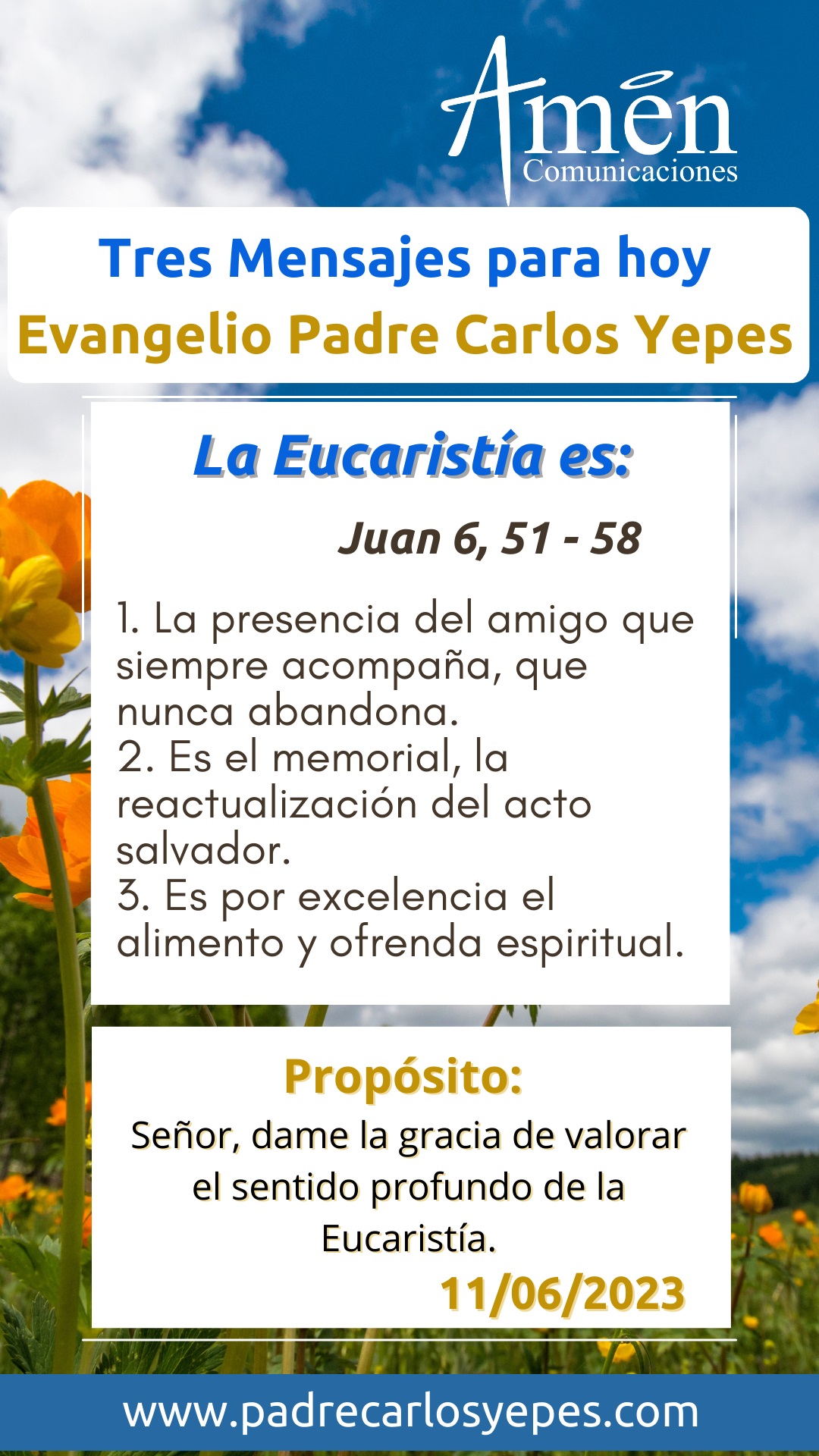 Hoy te invito para que reconozcas, sin el alimento de cada día, esa comida no se vuelve energía en tu cuerpo y sin el Pan de vida eterna no tendrás esa vida nueva, esa vida eterna de la que nos habla hoy Jesús en el evangelio. A veces decimos que no tenemos tiempo para ir a la Eucaristía, pero en el fondo, quizás no es tan cierto esto; decimos que la misa es larga y entendemos, no hay misas largas, hay amores cortos. Cuando no sientes fuego en tu corazón por la Eucaristía, tendrás cien excusas y un poco más para dejar de recibir este Pan de vida eterna, esta presencia por excelencia del amigo que nos fortalece, esta ofrenda espiritual que nos alcanzó la salvación y la actualización del memorial de Cristo que nos ha dado salvación y vida eterna a todos.