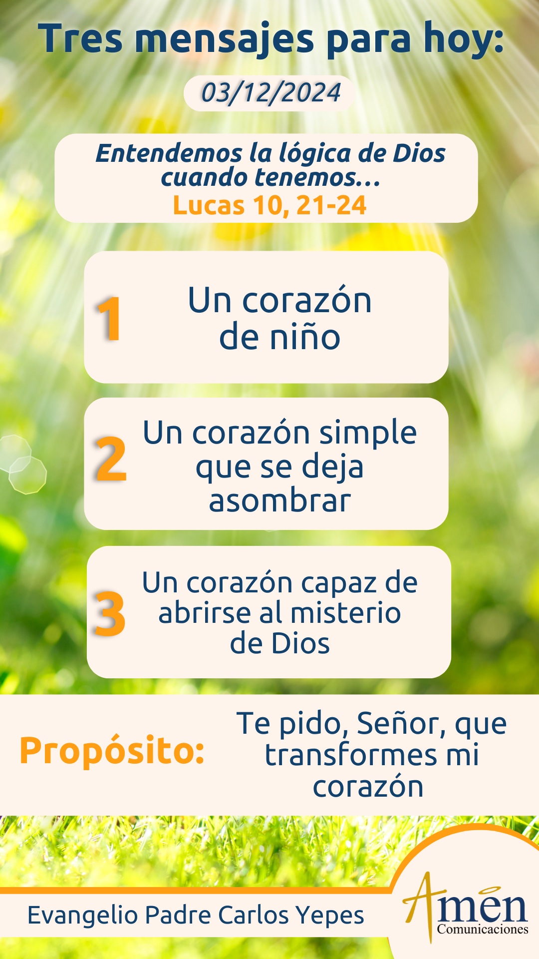 Hoy di de corazón, Señor, dame un alma simple, un alma de niño, y así solo podrás entender, como Jesús les dice a sus discípulos: “Bienaventurados los ojos que ven lo que ustedes ven, porque les digo que muchos profetas y reyes quisieron ver lo que ustedes ven, y no lo vieron, y quisieron escuchar lo que ustedes escuchan y no lo oyeron”. Créeme que podrás ver y escuchar con los ojos y los oídos de tu corazón a Jesús en esta Navidad, si aprendes a tener un corazón simple y sencillo.
