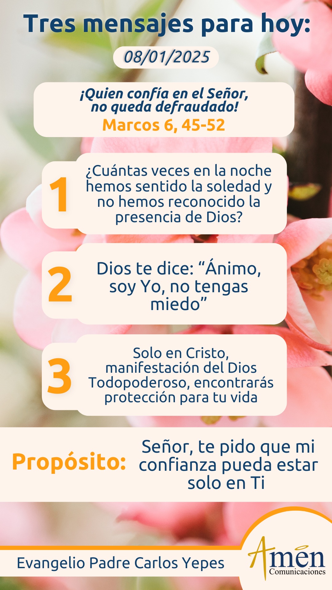 Cuántas veces en la noche cronológica o en la noche de nuestras vidas, hemos sentido la soledad, no hemos reconocido la presencia de Dios y, por el contrario, nos parece ver sombras o fantasmas que nos asustan. Hoy siente en las pruebas de tu vida, en ese examen médico que te vas a realizar, en ese empleo que parece que va a terminarse, en esa relación conyugal que no va bien, en esa dificultad familiar con un hijo, en esa situación emocional de asomos de una pequeña depresión. Reconoce quizás signos de la noche existencial, la oscuridad y las sombras sobre tu vida; pero escucha las palabras de Jesús no sólo hace dos mil años, sino de manera privilegiada al hoy de tu vida en el comienzo de este nuevo año, cuando te dice: “Ánimo, soy Yo, no tengas miedo”. Nos dice Marcos: “Que Jesús inmediatamente subió a la barca con los discípulos y al subir a la barca a la vida con ellos amainó el viento, cesó la furia del océano y ellos, en el colmo del estupor, de la sorpresa, no atinaban a entender no sólo la multiplicación de los panes y los peces, sino cómo Jesús tiene señorío, poder, dominio sobre los signos de la naturaleza, los signos del cosmos y empiezan a reconocerlo como Señor Dios, como Salvador de sus vidas. Por eso, al principio aterrados, luego lo adoran a Él”.