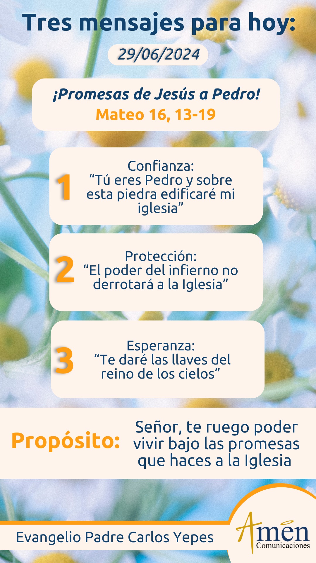 ¡Dichoso tú, Simón, hijo de Jonás!, porque eso no te lo ha revelado nadie de carne y hueso, sino mi Padre que está en el cielo. Ahora te digo yo: Tú eres Pedro, y sobre esta piedra edificaré mi Iglesia, y el poder del infierno no la derrotará. Te daré las llaves del reino de los cielos; lo que ates en la tierra quedará atado en el cielo, y lo que desates en la tierra quedará desatado en el cielo.