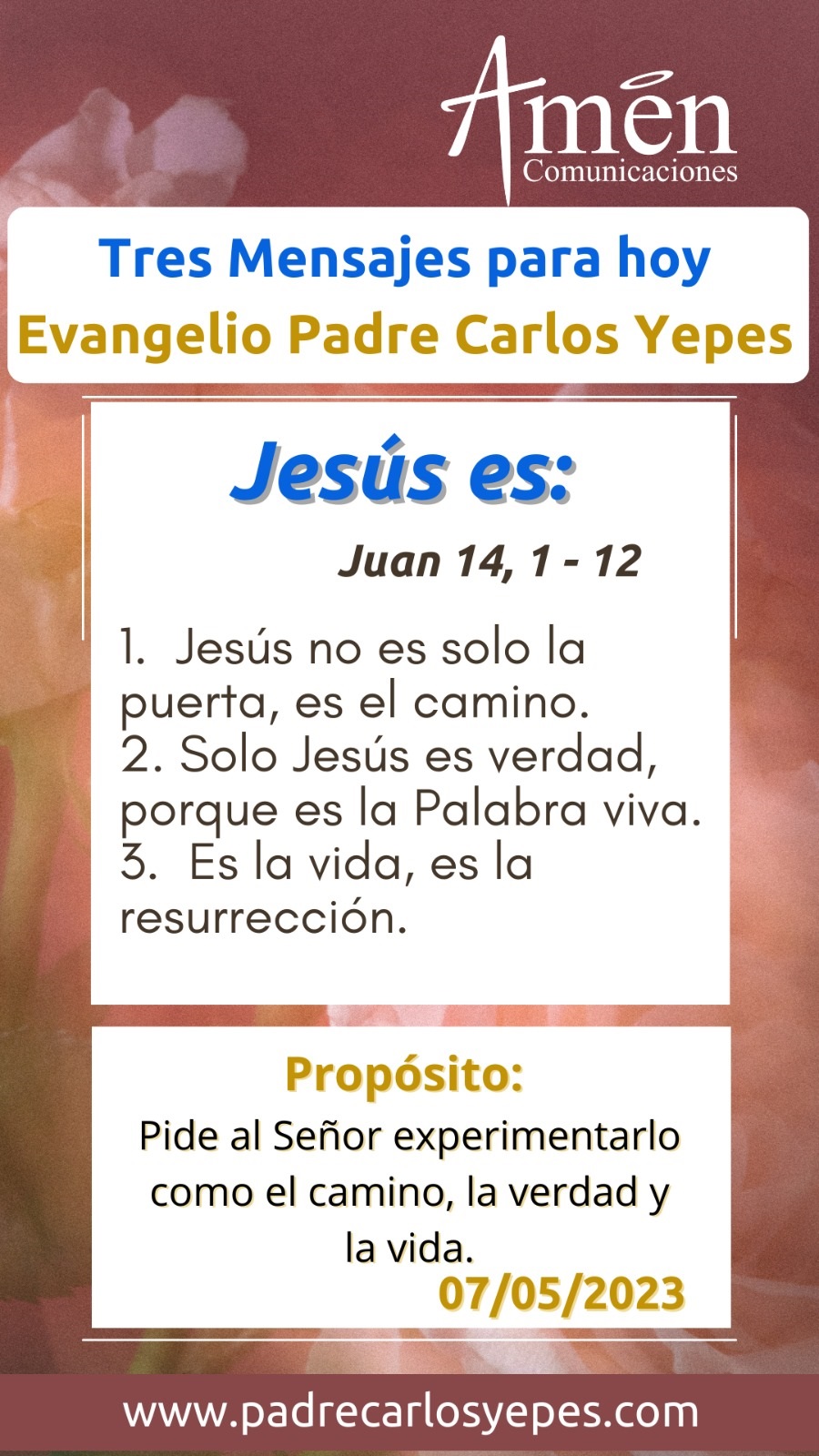 Hoy reconoce que Jesús no es solamente la puerta por donde entran al redil, al rebaño de ovejas, sino también que es ese camino cierto, donde no hay equívocos, donde encontraremos la felicidad, la plenitud de la vida, sin ninguna clase de engaños. Y esto lo ratifica en su segunda afirmación, cuando dice: “Soy la verdad”, y es que no es solamente el maestro, el rabino, el profeta; sino que es sobre todo el enviado de Dios, encarnación de la verdad misma, y repetimos esa afirmación: en un mundo, en una sociedad, en una cultura llena de ideologías, de publicidad, de mensajes en redes sociales donde te dicen la dicha de tu vida está en este restaurante, en esta comida, en la compra de este carro, en este viaje o paseo a una costa o a una playa paradisíaca.