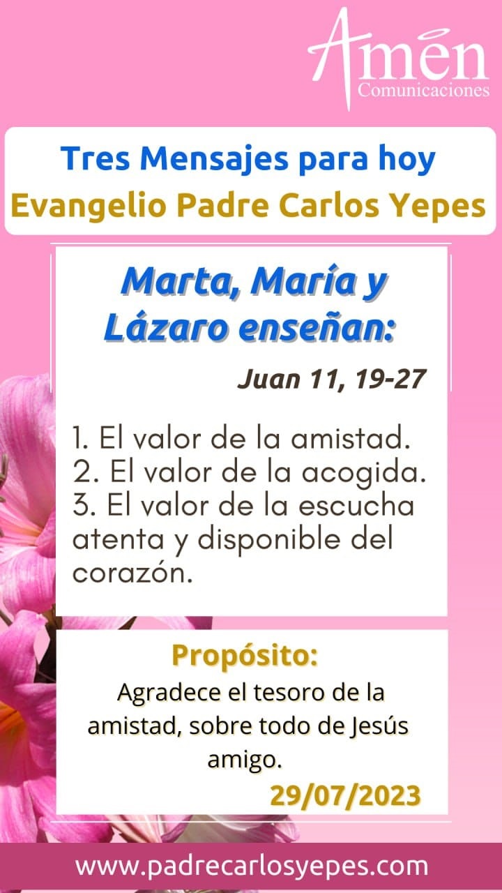 Hoy demos gracias a Dios, por estos tres grandes amigos de Jesús, Marta, María y Lázaro, y entendamos que la vida es bella, que la vida es en colores, que la vida tiene sentido, que en la vida hay plenitud, sólo cuando está Dios en ella, lo diremos con otras palabras, ¡Sólo cuando hay Dios amor, el amor de Dios en nuestras vidas!