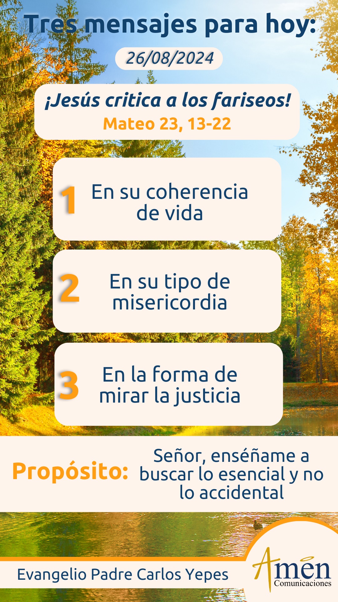Precisamos que los famosos ayes o reproches de Jesús, no son propiamente un llamado a la conversión de los fariseos, sino que, en el fondo, con dolor, es un anuncio del juicio severo que les espera a aquellos, que no entraron a la dinámica del evangelio y de la salvación, por la fuerza de la fidelidad, de la misericordia y de la justicia, como nos dirá el evangelio de mañana, sino que se quedaron en ser cositeros, detenidos en la casuística, en pequeñas cosas. Es que el texto de mañana, que lo podemos enlazar con el de hoy, nos habla de la justicia, la misericordia y la fidelidad, y la justicia en Mateo es la perfecta obediencia a la voluntad de Dios. La misericordia refleja esa relación con el prójimo y el modo de actuar de Dios, que siempre es compasivo, y la fidelidad es presentada como el mayor atributo de Dios en el antiguo testamento, y habla de un proceder consecuente, coherente, sin falsedades y sin doblez. Por eso, prescindir un fariseo o un escriba de la justicia, de la misericordia, de la fidelidad a Dios, es prescindir de lo esencial para quedarse en lo accidental, lo accesorio, lo formal, lo exterior. Fariseos siempre han existido y existirán, y en ti está, que mires si buscas lo esencial del evangelio, que es amar, perdonar, servir, gastar la vida por los demás, o te quedas simplemente en legalismos, en formas exteriores que fácilmente se pueden cumplir, violando de fondo el espíritu de la ley.