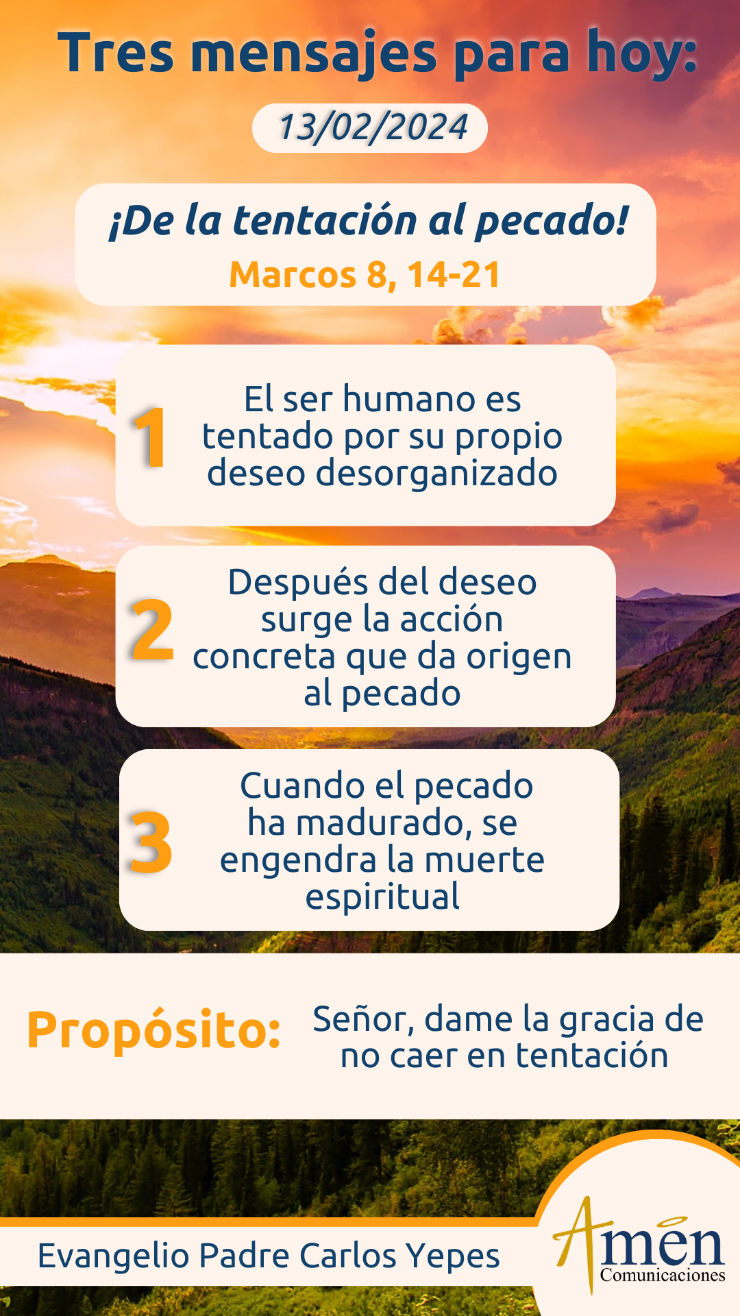 La primera lectura tomada de la carta del apóstol Santiago en el capítulo 1, Dios llama: “Bienaventurado, al hombre que es capaz de soportar la prueba, y si sale airoso, recibirá la corona de la vida que el mismo Señor ha prometido a aquellos que lo aman”. Pero a renglón seguido a diferencia el apóstol Santiago en su carta: “Que si bien las pruebas nos pueden venir de Dios, las tentaciones no vienen de Él, sino de cada uno de nosotros”; y de manera enfática afirmará: “Si alguien se ve tentado, que no diga que es Dios quien me tienta, pues Dios no tienta a nadie, Dios no induce a nadie al mal”. En una clara intuición psicológica y antropológica, señala tres etapas de la tentación del camino al mal, por el que pasamos todos los seres humanos.