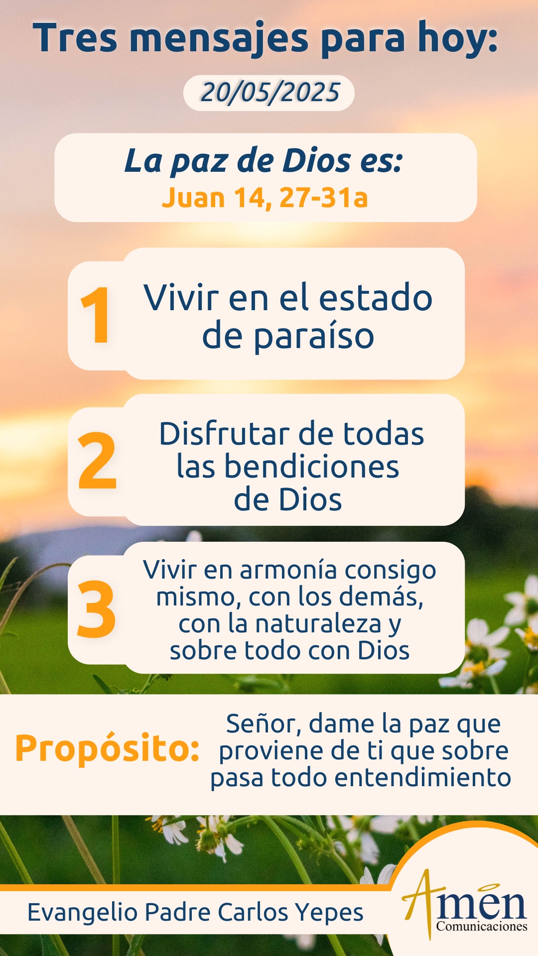 El mismo texto evangélico hoy nos dice que Jesús entrega la paz a sus discípulos, pero hace una aclaración, hace una precisión: “No les doy la paz como la da el mundo”. ¿La paz de los hombres es silenciamiento de fusiles?, ¿la paz de los hombres es el silencio de los cementerios?, ¿la paz de los hombres son las componendas políticas?, ¿la paz de los hombres son ciertas tensiones que se calman por el poder militar o económico de uno sobre otro? No, la paz de Dios es vivir en el estado de paraíso, en el estado de origen, cuando todas las bendiciones de Dios se le dieron al hombre, cuando vivía en armonía consigo mismo, con los demás, con la naturaleza y sobre todo con Dios. El ¡Shalom! hebreo en definitiva es la sumatoria de todas las bendiciones y parabienes que el buen Dios quiere para esa vida tuya, una vida que debe estar rodeada de la abundancia divina.
