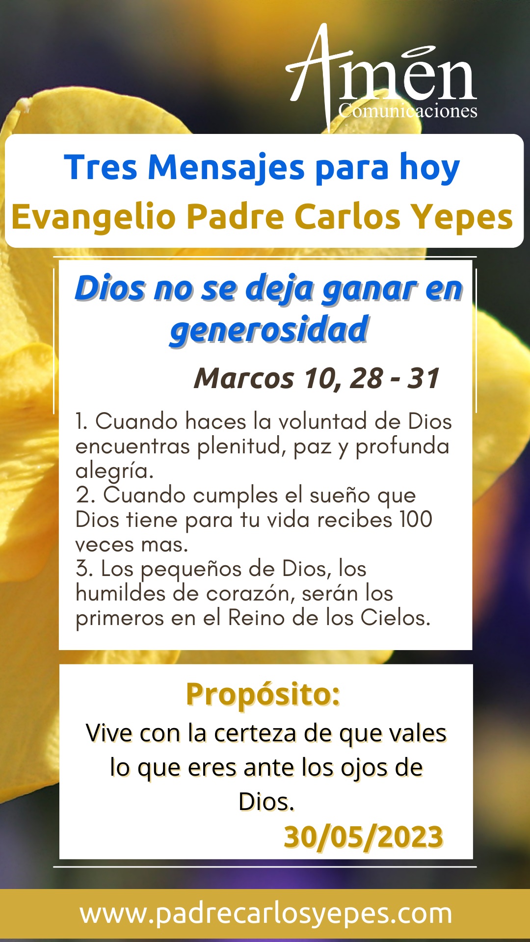 Pero te has preguntado, ya no por tu sueño, tu ambición o tu proyecto personal, te has preguntado ¿cuál es el sueño, que desde siempre Dios ha tenido para ti?, ¿qué es lo que Dios siempre ha soñado como proyecto, como misión para tu existencia?, y Él nos dice que si cumplimos el sueño que Él tiene para nuestra vida, nos dará una recompensa centuplicada, (cien veces más), en los bienes terrenales: casas, tierras y en los bienes afectivos, hermanos, padres, hijos, familia, afectos humanos. Así es Jesús, que no se deja ganar en generosidad, y si nosotros en fidelidad, le entregamos desde la sinceridad de nuestro corazón lo mejor de nuestra vida, Él nos lo devolverá centuplicado (cien veces más), aunque hace una precisión que puede parecer perturbadora, tendremos esto en la vida con persecuciones en el mundo, pero más allá de las persecuciones, en la edad futura alcanzaremos la vida eterna. Hoy te ánimo, para que creas en la promesa de Jesús, relativiza, renuncia, no le des el primer lugar en tu corazón a nada de esta tierra y recibirás cien veces más en este mundo terrenal, con persecuciones, pero, sobre todo, tu nombre quedará inscrito en el libro de la vida, porque alcanzarás la vida eterna con Dios.