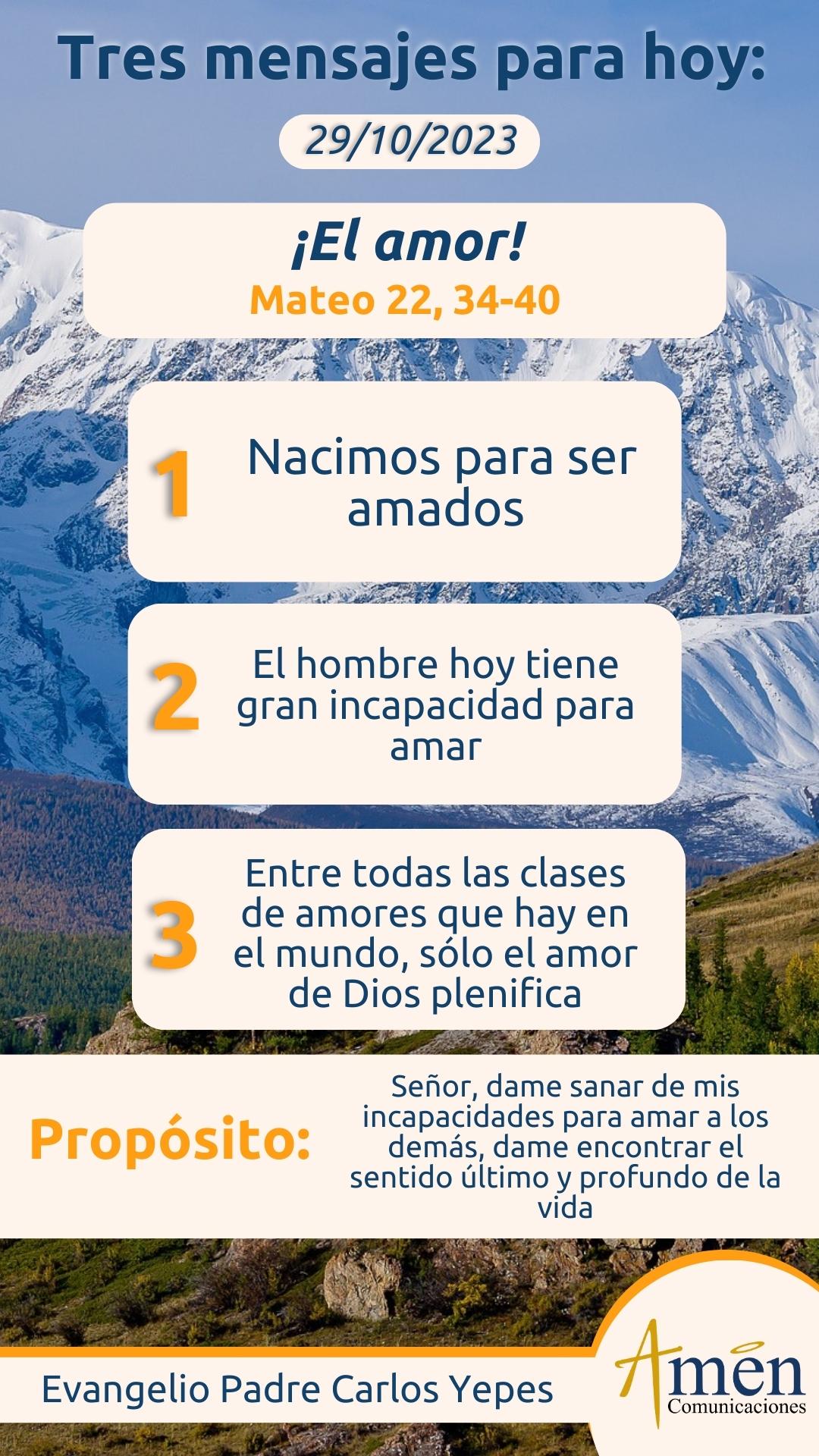 A propósito del evangelio de hoy, donde un experto en la ley religiosa pregunta a Jesús para ponerlo a prueba, “¿Cuál es el mandamiento principal de la ley?”. Extraigamos cinco grandes verdades sobre el amor del que nos propone el Señor: “Amar a Dios con todo el corazón y amar al prójimo como nos amamos a nosotros mismos”, que allí está toda la síntesis de la ley de Dios y del anuncio, el mensaje de los profetas.