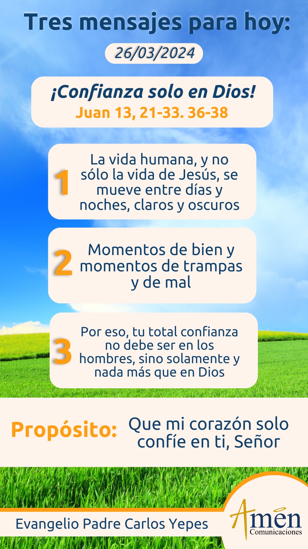 Hoy, en este evangelio, constatamos dos grandes punzadas en el corazón de Jesús, la traición de un discípulo y la cobardía y negación de un discípulo amigo. Por eso, cuando sientas en tu vida que en la mala hora algunos te han abandonado, te han negado o peor aún, te han traicionado, piensa que éste es el camino de la pasión que todo seguidor de Jesús debe cumplir; piensa que no podemos correr una suerte distinta de la del Maestro y que si Él fue traicionado y negado en el momento de la mala hora de la noche, de la oscuridad, ¿por qué a nosotros, sus discípulos, 2000 años después, no nos puede pasar? Esta es la fe cristiana y este es el drama humano divino que nos muestra, que nuestra total confianza no es en los hombres, sino solamente y nada más que en Dios.