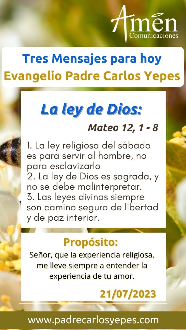 Señor, que la experiencia religiosa, la experiencia de tu amor, me lleve siempre a entender, que es experiencia de libertad y que nunca se puede esclavizar a nadie en nombre de Dios; por el contrario, las leyes divinas siempre son camino seguro de libertad y de paz interior.