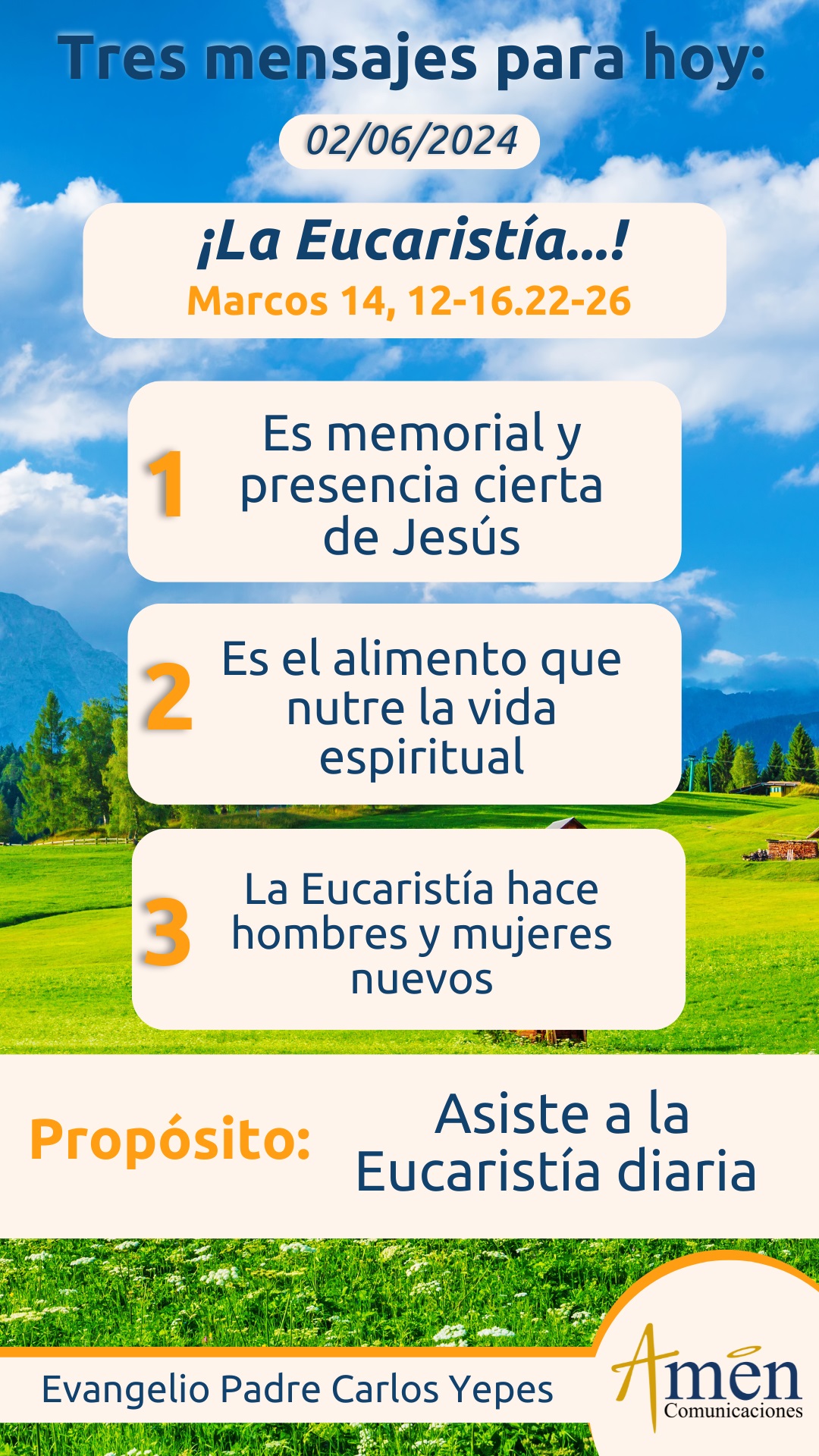 Pero además del memorial y de la presencia de Cristo en la Eucaristía, descubrimos en ella el alimento que nutre nuestra vida espiritual. Si desayunamos, almorzamos y cenamos para darle energía, salud y vitalidad a nuestro organismo, a nuestro cuerpo material; la Eucaristía claramente es el alimento para la vida espiritual. Cuánta gente en medio de una depresión tirada en la vida por pruebas y adversidades, empieza a celebrar con fe su Eucaristía de cada día y en menos de cien días, cien Eucaristías, son personas renovadas, alegres, fuertes interiormente, llenas de esperanza. No ocurrió el milagro per se, por sí solo; el milagro se da, porque a veces en personas muy jóvenes, vigorosas, pero de almas muy débiles y alejadas de Dios, cualquier prueba de la vida las derrumba; pero apenas empiezan a celebrar la Eucaristía de cada día y a nutrirse, a alimentarse, a comer el Pan de vida eterna, sienten la fortaleza, la paz, el discernimiento, la alegría y la esperanza que sólo provienen de Jesús, Pan de vida.