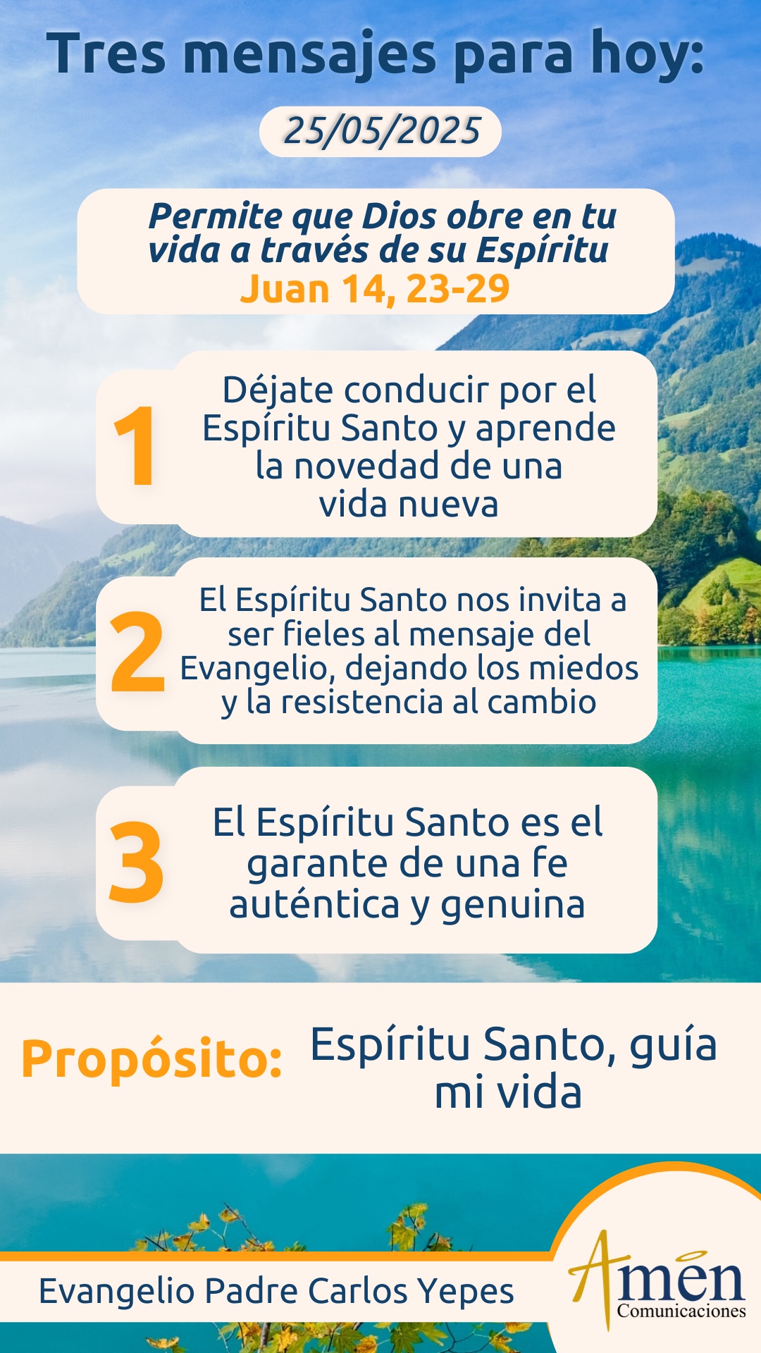En una tercera enseñanza, nos invita el evangelio de hoy a nunca sentirnos huérfanos. Juan llamará al Espíritu Santo el Paráclito, una expresión un poco extraña para nosotros, pero significa del griego parakletos, el que está a nuestro lado como defensor, intercesor, abogado, asistente, maestro, protector, auxiliador, sustentador de nuestra vida. El Espíritu Santo es el garante de una fe auténtica y genuina. Nos recordará y enseñará lo dicho por Jesús: “El Espíritu Santo es el gran acusador del mal espíritu del mundo que ha rechazado a Jesús cuando vino a renovar nuestra vida”. Cuando no se cree en el Espíritu Santo, en el fondo vivimos o se vive con miedo a la libertad y vivimos una vida empobrecida, sin sentido, rutinaria, sin novedad, una vida pesada. Reconoce que el Espíritu de Dios viene a hacer nuevas todas las cosas.
