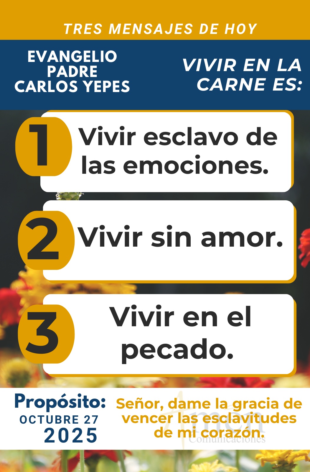 TRANSLITERACIÓN REFLEXIÓN PADRE CARLOS YEPES ¡La verdadera libertad! Una de las más impresionantes cartas del apóstol san Pablo, donde se muestra toda la madurez teológica y espiritual, y si se quiere mística por la experiencia que tiene el apóstol de sentirse “hijo muy amado por adopción del buen Dios”, es sin lugar a duda la Carta a los Romanos. En este capítulo 8, Pablo afirmará: “Somos deudores pero no de la carne para vivir según la carne”. Cuántas veces hemos escuchado este texto, y sin embargo, no lo comprendemos plenamente. Vivir en la carne no es nada diferente, sino de vivir según nuestra naturaleza humana: los impulsos, los deseos, los apetitos, las ambiciones de nuestra naturaleza como hombres, como mujeres, cuando aún no se han abierto a la redención, no nos hemos abierto al Espíritu del Resucitado. Pablo afirmará: “Que si vivimos en la carne moriremos”. Y en el fondo es la comprobación a nuestro alrededor quizás en nuestra propia vida: vivir en la carne es ser esclavos de nuestros miedos, envidias, ambiciones económicas desmedidas, rabias, resentimientos y rencores, orgullos y vanidades frente a los hombres, orgullos y vanidades frente al mundo. Vivir en la carne es vivir de incapacidad para amar con libertad y con plenitud. Por eso nos lleva a la muerte el pecado, como dirá Pablo en otro pasaje: “La paga del pecado es la muerte”. Cuántas personas se sienten muertas en vida a pesar de que materialmente, humanamente parecen tener todo lo que el mundo les ofrece como supuesto camino de plenitud. Pero continuará el apóstol Pablo afirmando: “Si vivimos según el Espíritu que da muerte a las obras de la carne, vivirán”. Aquí está una de las más poderosas intuiciones y mensajes de toda la teología paulina, de todo el mensaje de san Pablo, ¡vivir en el Espíritu de Cristo Resucitado!, ¿acaso esto es posible? Claro que sí, para un hombre, para una mujer creyentes, abiertos plenamente en su corazón a Dios. Cuando sientes que el mundo no es capaz de llenarte, de darte plenitud de vida. Cuando sientes que a pesar de que en lo humano pareces tenerlo todo, pero te experimentas miserable como si no tuvieras nada verdaderamente valioso en tu vida, es el momento de explorar otro camino, el de la fe, el de los creyentes, y sentir que sólo cuando nos abrimos a la vida nueva, a una forma de existir distinta que nos ofrece Cristo Resucitado, habrá en nosotros paz y una paz profunda; habrá en cada uno libertad y una libertad interior que nunca habíamos conocido a lo largo de los años de nuestra existencia, habrá verdad y nos sentiremos con la sabiduría para juzgar, donde hay veracidad, donde hay engaño o apariencia en los hombres y en los mensajes del mundo, habrá gozo que es alegría interior, habrá amor en el corazón. Todos estos valores: paz, libertad, verdad, gozo o alegría interior y amor, hacen que en la vida haya plenitud. Es la vida de los santos, es la vida de algunos creyentes hombres y mujeres de a pie, que viven con una profunda alegría, un profundo gozo, que el mundo no logra comprender. A veces sin tener muchas cosas, muchos afectos se sienten dueños del mundo entero porque tienen a Dios en su corazón. Hoy te invito a que medites, a que reflexiones este precioso texto de la Carta del apóstol san Pablo en el capítulo 8, que nos invita a sentirnos hijos de Dios, herederos de su gloria, a superar los miedos a la muerte, miedo al fracaso, miedo a la soledad, miedo al qué dirán, miedos y falsos respetos humanos que nos roban la alegría de vivir. Hoy reconoce, que el Señor es grande, y lo prueba claramente en el evangelio, cuando con una inmensa libertad interior Jesús el Maestro, Jesús el hombre Dios el Mesías, le dirá a esta mujer que llevaba muchos años enferma “que queda liberada”, por encima de legalismos cultuales como la ley del sábado en la que supuestamente no se podía hacer nada y por la que le reclama el jefe de la sinagoga, un hombre que vivía en carne, que si bien aunque aparentemente era un hombre religioso jefe de la sinagoga, no había conocido verdaderamente de Dios. Jesús se presenta entonces como el hombre pacífico, el hombre libre frente a la ley absurda y ritual del sábado que impedía curar, un hombre que es capaz de amar, porque busca la sanación, el bien para esta mujer. Y un hombre que es capaz de encontrar la verdad, porque denuncia la hipocresía del jefe de la sinagoga, señalándole: “Acaso si en un día sábado si tiene un animal a su servicio, un buey o un burro en el establo, ¿no lo lleva a abrevar, a beber agua si está sediento?, cuánto más no vale un ser humano”. Hoy siente la alegría inmensa, la dignidad formidable de ser hija, hijo de Dios; con esto te digo, siente el gozo de heredar la paz, la libertad, la alegría interior, la verdad, el amor, que Jesús recibe del Padre Dios y que quiere que nosotros recibamos a través de Él y por el cual somos hijos adoptivos y hermanos en el hermano mayor que es Jesucristo. Esto es la vida cristiana y no solamente normas del derecho canónico, esta es la verdadera vida en Cristo, y no solo doctrina o dogma a veces muy rígido y a partir de definiciones, esta es la verdadera vida y no solamente la ritualidad o una liturgia estricta; esta es la verdadera vida cristiana, y no solamente una moral que a veces no alcanzamos a entender, porque no la asumimos ya que no tenemos el Espíritu del Resucitado y la libertad gloriosa de los hijos de Dios. Bendícenos en este día y digamos con el Salmo: ¡Bendito sea el Señor que nos salva, que actúa en nosotros, que sana nuestras vidas y nos hace hombres y mujeres nuevos! Que el Señor te bendiga abundantemente en este día. En el nombre del Padre, y del Hijo, y del Espíritu Santo. Amén.