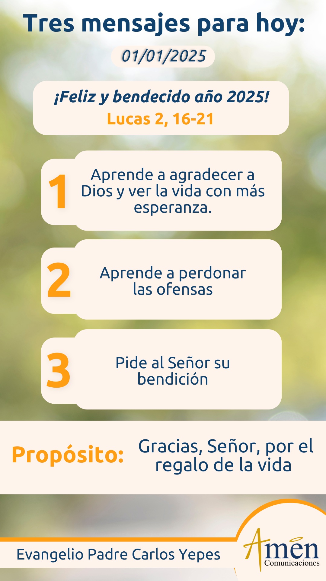 Terminemos, además, uno, de agradecer y mirar con esperanza el nuevo año. Dos, de clamar el perdón de Dios en esta Jornada Mundial de Oración por la Paz. Tres, recibamos la bendición especialísima que la liturgia de la Iglesia nos ofrece en este día, recordándonos la primera lectura del Libro de los Números, cuando el Señor dice a Moisés: “Que ordene a Aarón y a sus hijos, que cuando vayan a bendecir al pueblo elegido, digan las siguientes palabras” (que hoy las hacemos propias en nuestra vida). Que esta bendición llamada aronitica llegue a tu vida, a tu familia, a tu corazón, deseándote lo mejor, los más grandes parabienes y bendiciones en el nuevo año, y que sepas que Dios no abandona tus luchas, que Dios se compadece de tu vida, que cuando lo sientes más distante y más lejano, es todo lo contrario. Es cuando más cerca, más atento y más pendiente está de tu vida, de proveerte, de sanarte, de cuidarte.