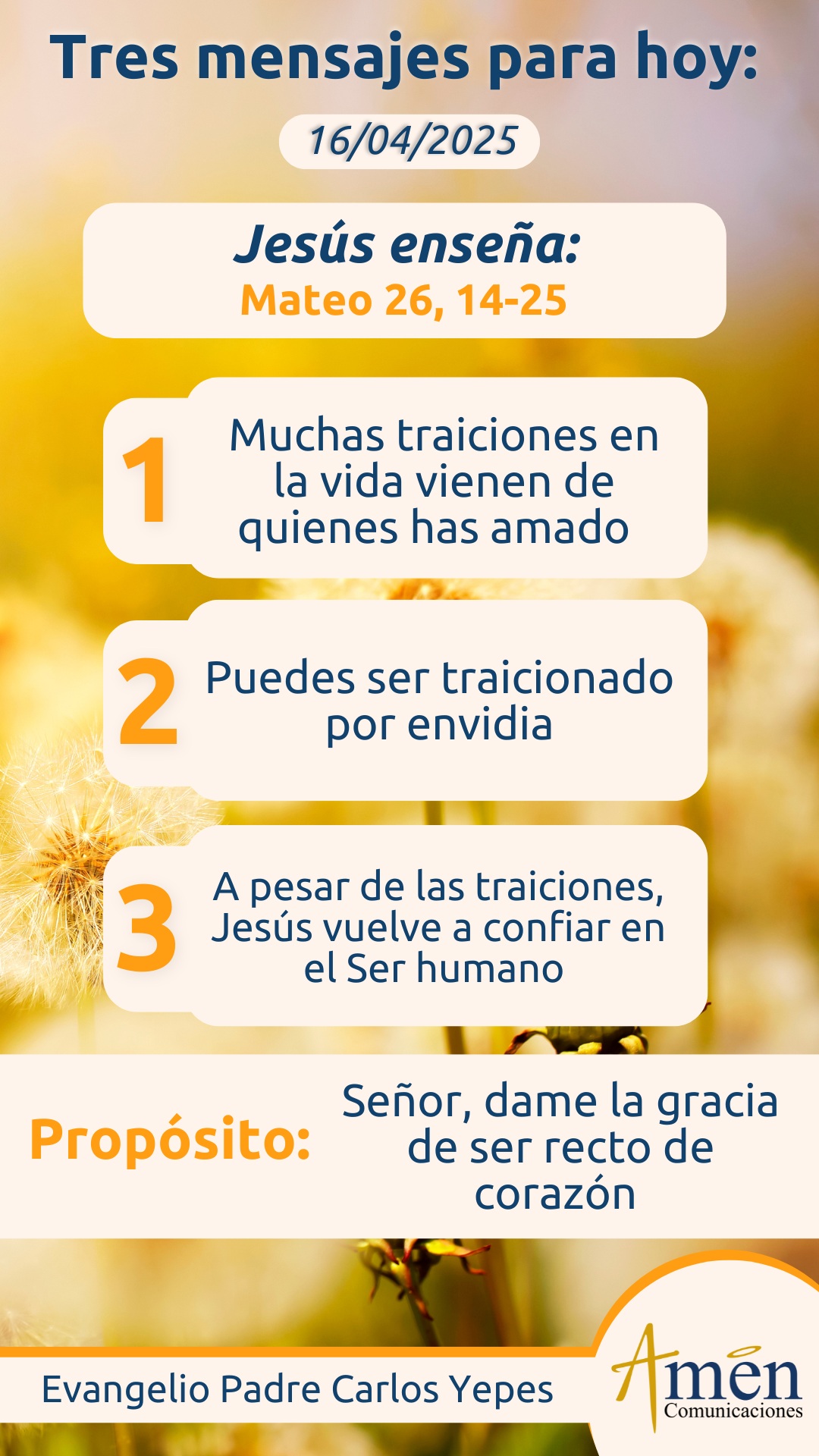Pero además de ser el amigo especial de Jesús, Judas, descubramos que el traidor estaba al lado de Jesús y estaba al acecho cuando dice el evangelio: “Desde entonces buscaba ocasión propicia para entregarlo”. Hoy reconocerás con no poca perplejidad en tu vida que personas que te han traicionado, son seres humanos que compartían contigo, que sabían de tus dolores, que conocían tu vida, que estaban a tu lado, que eran enemigos agazapados, o pensemos que en su momento fueron amigos, pero la condición interior, la condición del corazón que es veleidosa, los cambió radicalmente. Cuántas personas he escuchado en la vida que me dicen: “Padre, nunca hubiera imaginado de tu expareja, de un hermano, de un exsocio, de un examigo semejante traición y todo el tiempo lo tuviste a tu lado, te confiaste a él, a ella y luego te pagó como te pagó”.