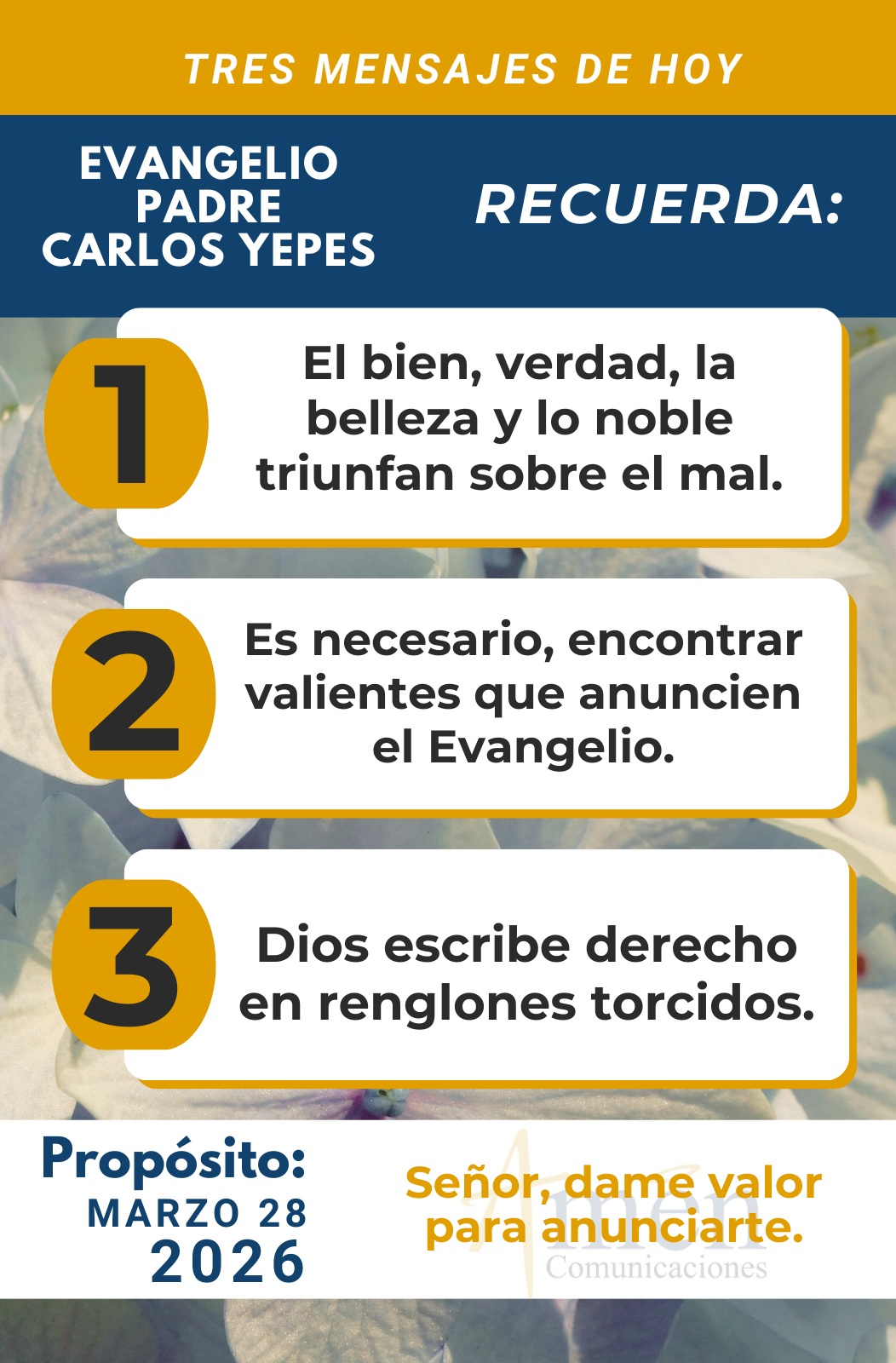 Que el Señor, que es rico en misericordia, ilumine tu entendimiento, fortalezca tu fe y te bendigo en este día. En el nombre del Padre, y del Hijo, y del Espíritu Santo. Amén.