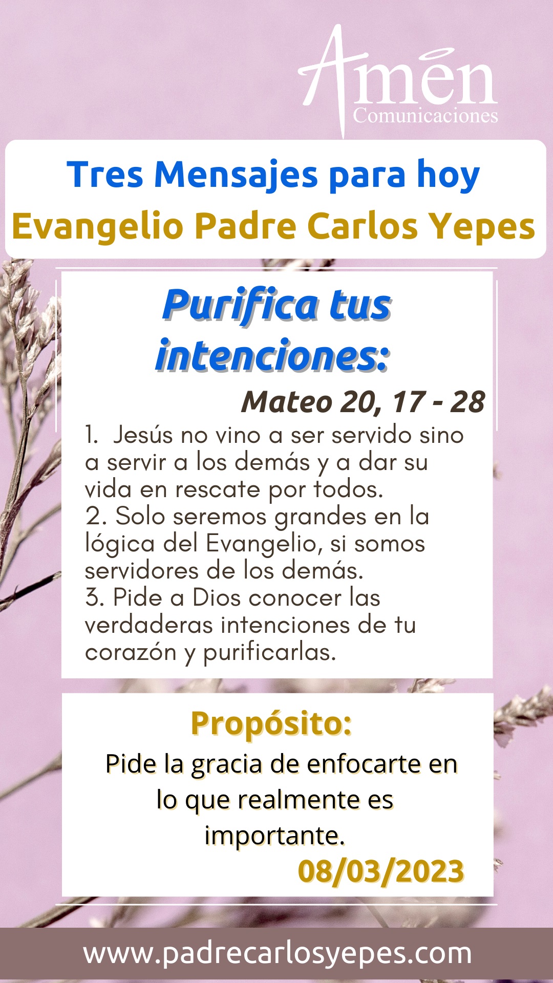 Hoy Señor, te pedimos, danos la gracia de conocernos en profundidad y más allá de Santiago y Juan que tenían una ambición pública o los otros diez discípulos que podían tener una ambición secreta, danos conocer las verdaderas intenciones de nuestro corazón y purificarlas. Al final cuando vamos viviendo, descubrimos que todo en el mundo es vanidad porque todo pasa, solo Dios permanece.