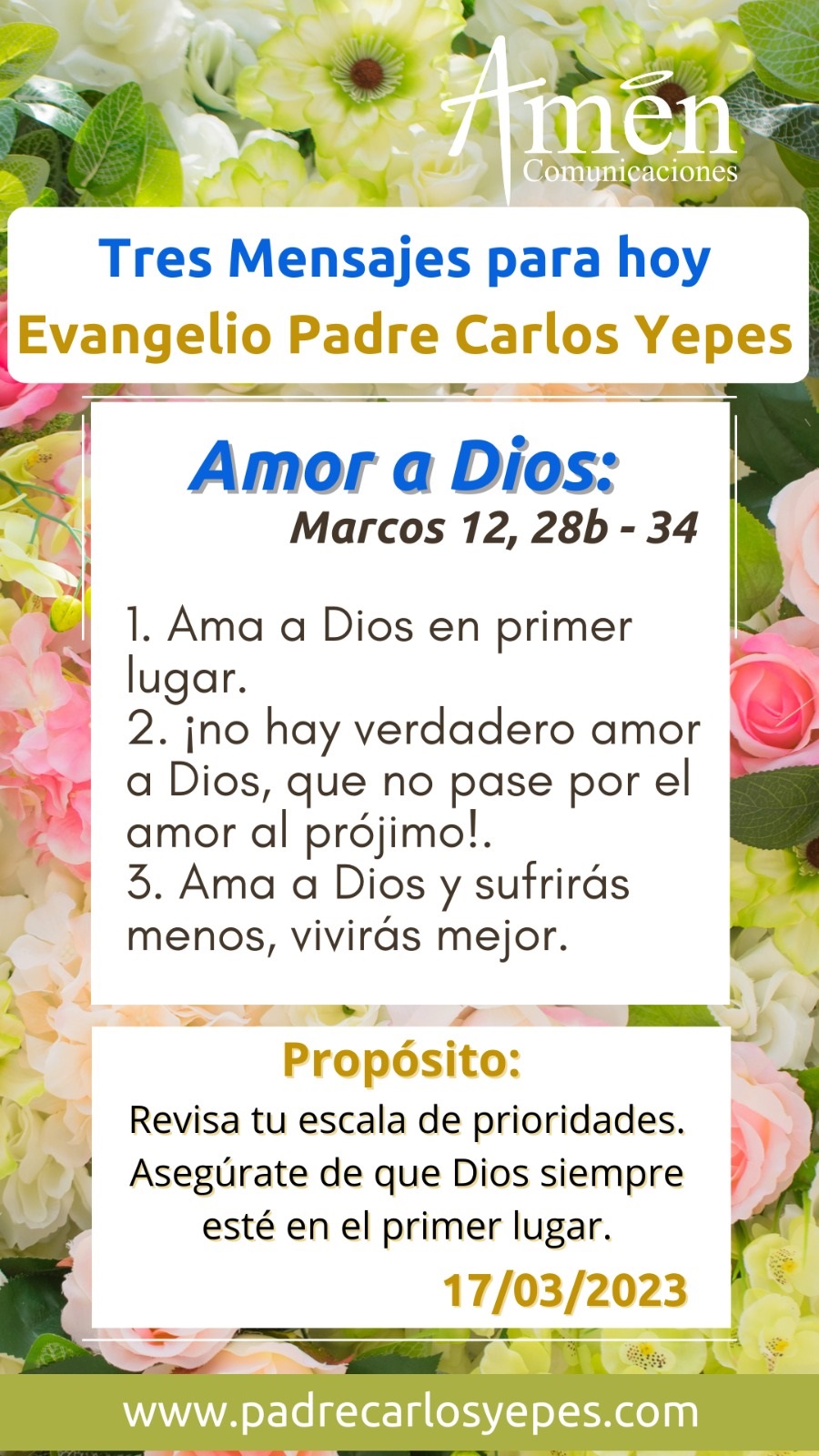 Hoy querido amigo, amiga, descubre, que buena parte de tus sufrimientos en este día, se han dado porque le diste el primer lugar en tu corazón, le diste el lugar de Dios, a quién sencillamente no es Dios: un hijo, un esposo, una empresa, un trabajo, un dinero; cuando uno idolatra, cuando uno endiosa, cuando uno deifica, personas, cosas, empleo, bienes, aun la propia imagen, de alguna manera se expone a terribles sufrimientos, porque ninguna de estas realidades es absoluta; por el contrario, todas estas realidades del mundo son caducas, efímeras y cambiantes, el único que siempre está, el único que nunca pasa, el que siempre nos va a sustentar, el que siempre nos va amar es Dios, por eso nos pide darle el primer lugar en nuestro corazón.