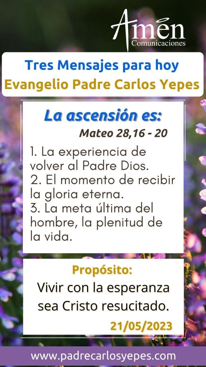 Hoy, reflexionemos de tres maneras. La primera, la Ascensión es una dinámica pascual, que nos lleva de alguna manera a reconocer que el fin de la vida no es que nuestras cenizas o nuestros huesos reposen en un campo o cementerio, no; la Ascensión nos muestra, que definitivamente la meta última del hombre está con Dios, que no podemos pensar que todo termina con la muerte y aquí en este mundo, sino que estamos llamados a volver al origen, la fuente, el manantial fecundo de donde todos nacimos, Dios.