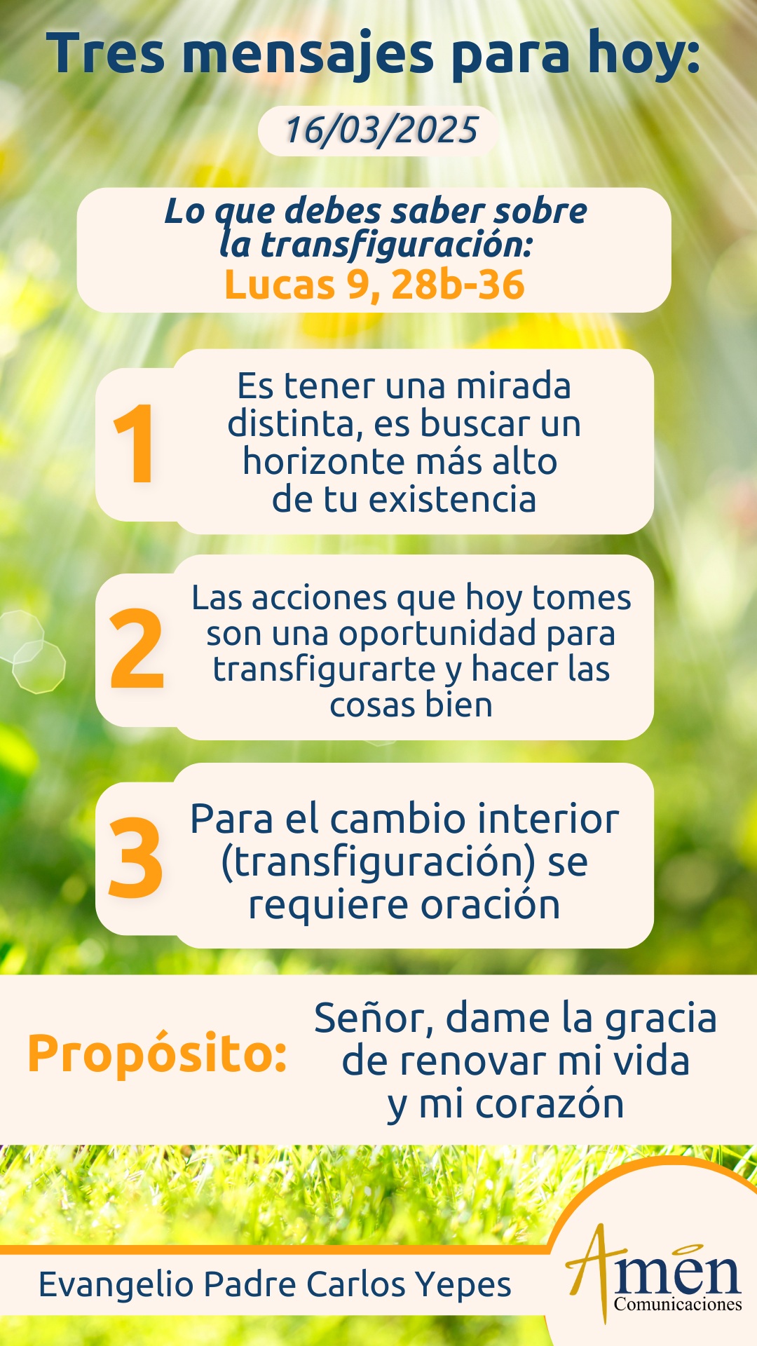 Hoy descubre que no sólo en el monte Tabor (nuevo testamento), sino también el Ur de Caldea (antiguo testamento), Dios sigue haciendo sucesivas alianzas con nosotros y nos invita a renovar la vida, a cambiar el corazón y a ser hombres y mujeres con un corazón nuevo, un corazón transfigurado.