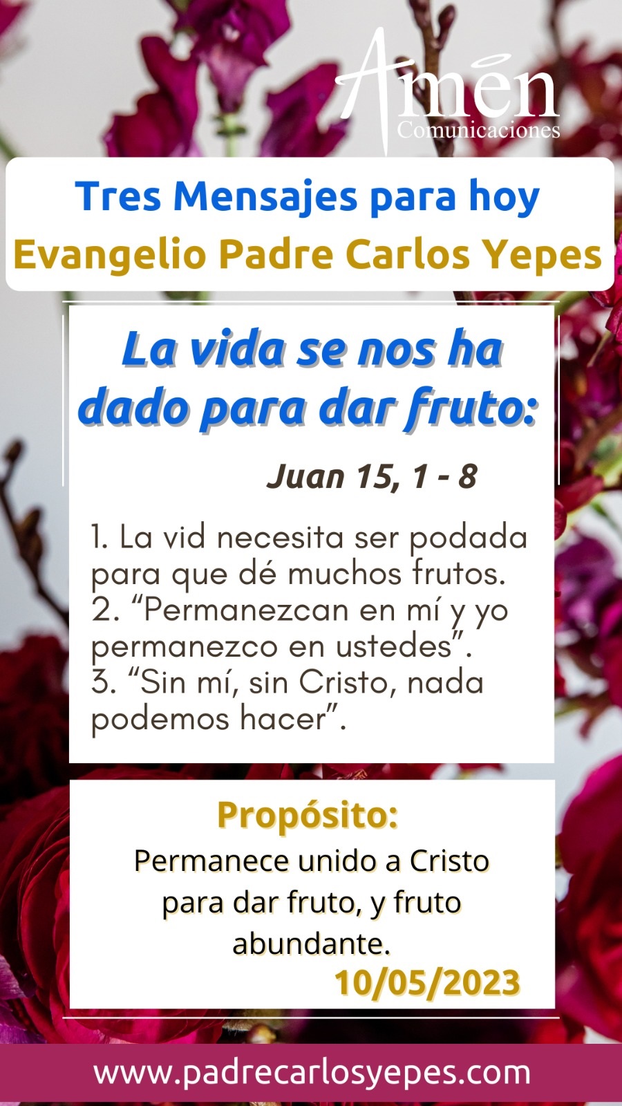 La primera expresión que lanza es, que la vid necesita ser podada para que dé muchos frutos, entiende por qué un alma buena, un alma entregada, a veces vive pruebas; léelo y reléelo en el texto de hoy: necesitamos ser podados, necesitamos ser pulidos, necesitamos ser purificados para dar fruto más abundante del Señor en nuestra vida; por el contrario, aquel sarmiento, aquella rama, aquel hombre o mujer que no da fruto espiritual, simplemente se corta, se arranca y se tira al suelo para ser quemado.