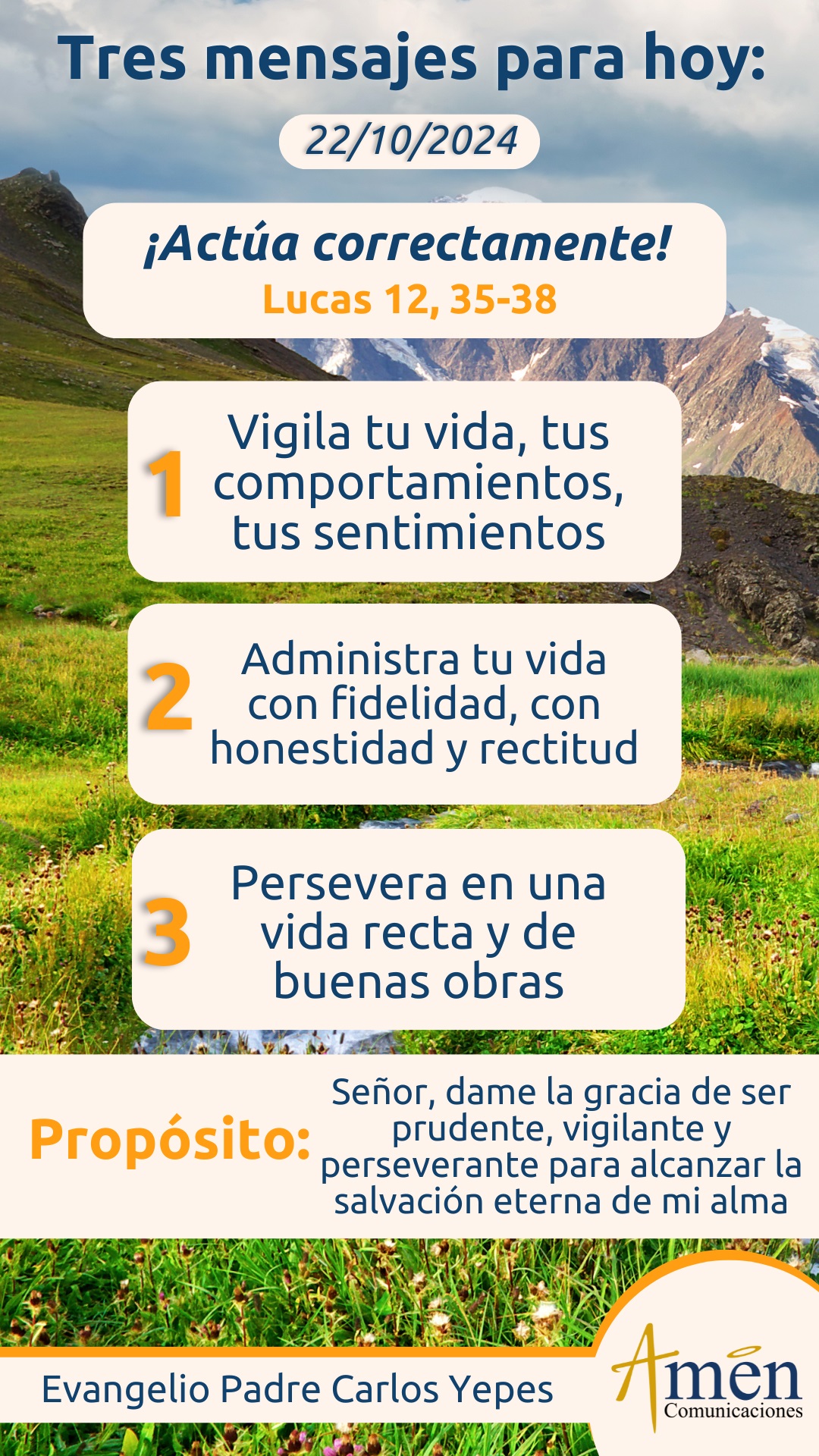 Pero pasemos al evangelio de hoy, donde encontramos a partir de Lucas capítulo 12, una triple invitación: la primera, a la vigilancia sobre nuestra vida, sobre nuestros comportamientos, sobre nuestros sentimientos, sobre cuáles son los valores o principios rectores u orientadores de nuestra vida. En efecto, dirá Jesús a sus discípulos y hoy a nosotros: “Tengan encendidas las lámparas, ceñida a su cintura, estén como los hombres que aguardan a que su Señor y Dios vuelva de la fiesta de bodas, para abrirle la puerta apenas venga y llame, toque a esa puerta”. Es que la vida del creyente es una vida de vigilancia, no podemos vivir atolondrados, despistados, adormilados, aturdidos, comprando, vendiendo, comerciando, mirando chismes en redes sociales, en TikTok, en Facebook y demás, sino que la vida es de una vigilancia sabiendo, que el día en que se presente el Señor y nos llame a su presencia, daremos cuenta de cómo hemos vivido, por eso hay que vigilar sobre nuestro comportamiento y hacer el bien hoy, perdonar hoy, servir a los demás hoy, entregar cariño hoy, practicar la justicia hoy, porque nadie tiene garantizada la vida para mañana y seremos juzgados como dice Mateo capítulo 25: “Por el bien y el amor que hayamos dado a los demás”.