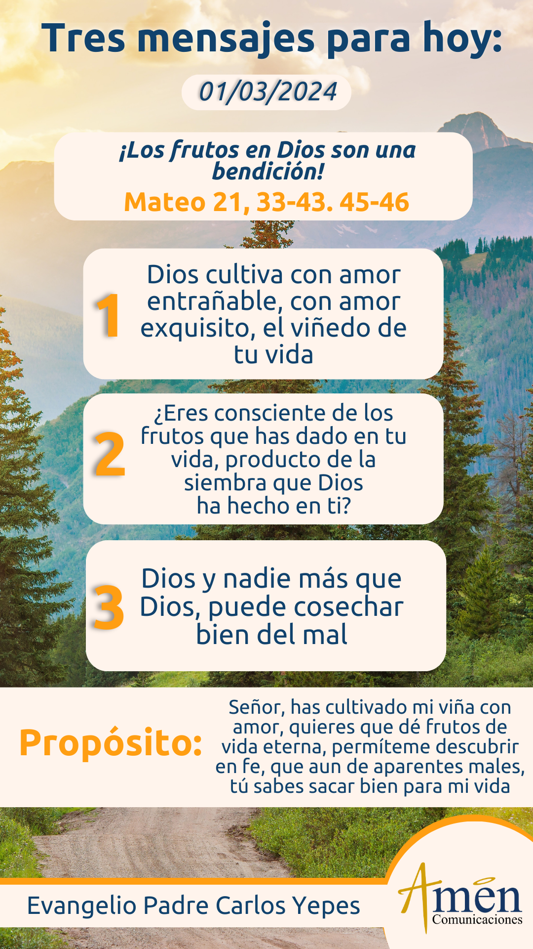 La primera, Dios cultiva con amor entrañable, con amor exquisito, la finca, el viñedo de nuestra vida; no es otro el sentido del evangelio de hoy de san Mateo, capítulo 21, donde descubrimos que más allá de plantar la viña, rodearla con una cerca, construir el lagar para exprimir las uvas, levantar la torre del guardián, Dios a cada uno de nosotros nos cuida, nos cultiva, nos abona, nos protege, nos llena de carismas, talentos, dones para ponerlos al servicio de los demás, nos levanta cuando estamos caídos y nos da nuevas oportunidades para que siempre nuestra vida esté llena de frutos abundantes.