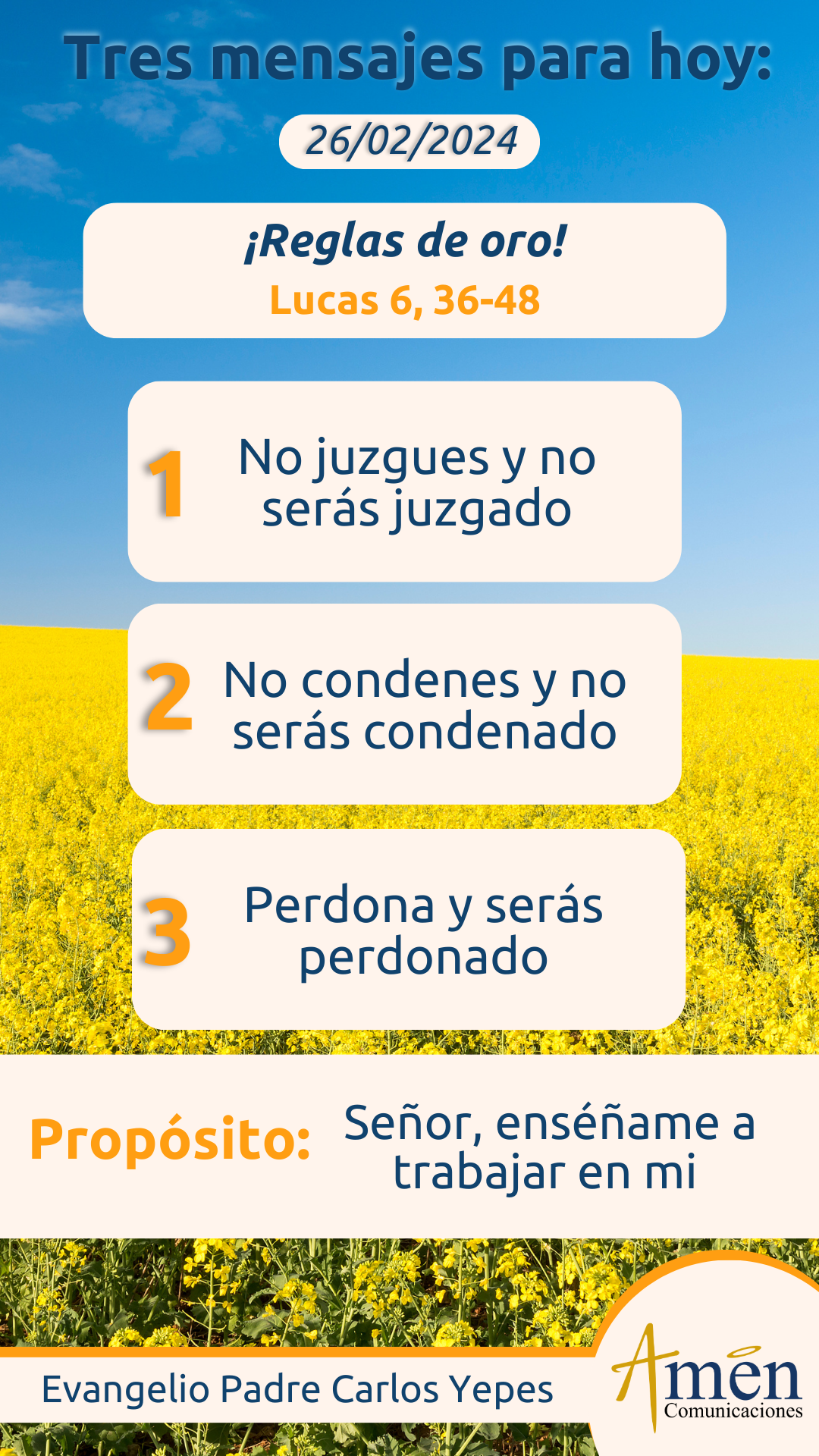 En aquel tiempo, dijo Jesús a sus discípulos: «Sean misericordiosos como su Padre es misericordioso; no juzguen, y no serán juzgados; no condenen, y no serán condenados; perdonen, y serán perdonados; den, y se les dará: les verterán una medida generosa, colmada, remecida, rebosante, pues con la medida con la que midan se les medirá a ustedes».