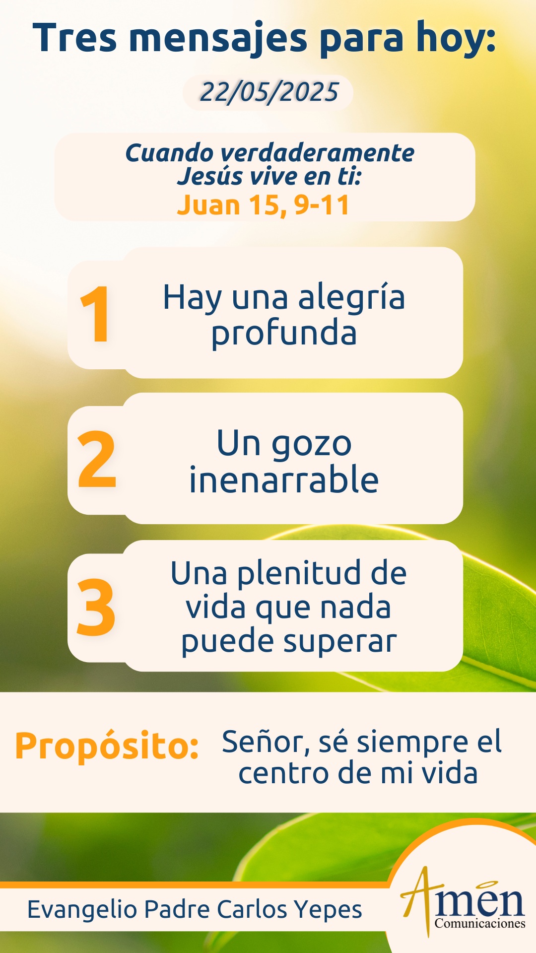 TRANSLITERACIÓN REFLEXIÓN PADRE CARLOS YEPES La primera lectura de los Hechos de los Apóstoles nos muestra un eterno dilema, entre si salva el cumplimiento de normas, ritos, leyes dados en su momento por Moisés al pueblo judío, al pueblo de Israel, o salva la acogida a la gracia de Dios, a la vida nueva que Él nos regala. Los discursos de Pedro y de Santiago, que nos muestra hoy la primera lectura, subrayan sobre todo frente a este dilema, la actuación de la gracia de Dios en la conversión de los hombres, pero sobre todo de los pueblos gentiles, esto es, no judíos. El caso concreto de Cornelio, que nos habían presentado ya en los capítulos 10 y 11, de Hechos de los Apóstoles, sirve de pauta al apóstol Pedro para interpretar el plan de Dios sobre aquellos hombres no judíos o llamados paganos. Es que Dios no ha hecho distinción entre el pueblo inicialmente elegido, Israel y el nuevo pueblo, la gentilidad; les ha dado el mismo espíritu, los ha purificado igualmente y les muestra que la salvación nos viene sobre todo por la gracia, la vida nueva del Señor Jesús y no por el yugo insoportable de un cúmulo de preceptos y de normas. Esto lo entendió mejor Pedro (el jefe de la Iglesia), que el rígido apóstol Santiago, que se muestra menos avanzado en la comprensión de esta verdad suprema que al final de la lectura de hoy, de todas maneras, aunque acepta la gracia de Dios como la gran fuerza salvadora para el hombre y para el discípulo en Cristo, impone cuatro cláusulas supuestamente dirigidas a mantener la convivencia mutua entre judíos y gentiles. Y habla de: “Abstenerse de contaminarse de los ídolos, de uniones ilegítimas, de no comer animales estrangulados y la sangre de los mismos”. En el fondo sigue cumpliendo con la ley y olvidamos que es el Señor y la vida nueva, la que Él nos comunica, la que nos hace hombres llenos de plenitud existencial. Pero pasemos al evangelio de hoy, donde reconocemos tres hermosas expresiones. Jesús dirá a los suyos: “Que se siente profundamente amado por el Padre Dios y que de la misma manera que el Padre lo ha amado, así Él nos ama a todos nosotros”; y nos invita, en la línea de evangelios precedentes: “A permanecer en el amor”. Si somos tan delicados en la amistad, en el noviazgo, en el comienzo de la vida matrimonial, por cuidar una relación esponsal, por vivir delicadamente esa relación en respeto, en acogida, en detalles de cariño, ¡cuánto más debemos de cuidar la relación de amor con el Señor! Y si el Padre Dios ha amado a Cristo y Cristo nos ha amado a nosotros, estamos llamados a cuidar esa relación delicada y exquisita de amor de Cristo hacia nosotros aún más, mucho más que relaciones de amores humanos entre hermanos, entre novios, entre amigos, entre esposos, entre familia. En un segundo momento, Jesús nos da la clave para permanecer en el amor, y es una que hemos señalado también en evangelios precedentes: “Sólo cuando escuchamos la Palabra del Señor, la guardamos en el corazón, la obedecemos en los detalles mínimos de la vida diaria, siendo compasivos, no murmurando, ni juzgando de los demás, siendo justos en nuestras actuaciones diarias, teniendo misericordia de los demás, sirviendo a otros mientras podamos servir, perdonando aunque de momento nos cueste perdonar, si guardamos los mandamientos de Jesús, obedecemos sus preceptos de amor, justicia y paz, verdaderamente permaneceremos en el amor de Dios. No lo olvides, no son prácticas externas, no son oraciones con los labios, no es simplemente dar un diezmo, una ofrenda dominical en tu parroquia. Es el amor, la compasión, el perdón, la justicia, la paz interior, la entrega generosa a los demás, que son las grandes acciones del mensaje revolucionario de Jesús, que hará que seas un verdadero discípulo del Maestro, que seas un auténtico cristiano en letras mayúsculas. Sólo obedeciendo sus mandatos podremos permanecer y vivir y experimentar la grandeza del amor de Cristo. Finalmente, el evangelio de hoy (corto pero muy denso), nos habla: “De la alegría que tendrán los discípulos de Jesús, una alegría en plenitud, una alegría como nunca hemos conocido en la vida, si nosotros guardamos la Palabra del Señor”. Hoy, cuando hablamos tanto de la felicidad, cuando hablamos tanto de una vida en plenitud, cuando se habla no solamente del bienestar sino del bien ser, descubre que el bienestar lo puede dar cosas externas a ti, pero el bien ser lo da Dios interno, interior a ti mismo. Como decía bellamente Agustín de Hipona: “Nos hiciste, Señor para ti, y nuestro corazón andará inquieto hasta que no descanse en ti”. Reconoce esa alegría abundante cuando Dios vive en ti, cuando el Señor actúa a través de tus palabras, de tus manos, de tu cuerpo, cuando Dios se sirve de tus fuerzas hasta el cansancio, hasta la entrega máxima para darte amorosamente a tantos sufrientes de esta tierra. Y descubrirás que verbos como compartir, dar, amar, perdonar, orar, son verbos que en el fondo surgen espontáneamente de una persona que ha dejado vivir a Jesús en su corazón. Pablo lo dirá de manera magistral, (en una expresión que me encanta citar): “Ya no soy yo el que vive, es Cristo el que vive en mí; y mientras vivo en esta carne, aunque me siento crucificado, vivo por la fe en aquel que me amó y se entregó por mí”. Hoy reconoce que cuando verdaderamente Jesús vive en ti, hay una alegría profunda, un gozo inenarrable, una plenitud de vida que ni las mejores comidas, los vestidos más elegantes, los carros más lujosos, los cargos más importantes en una empresa multinacional, los viajes a los lugares más exóticos del mundo, los placeres de la comida, del sexo, de la carne, de las hormonas, nada de esto, nada se compara con la alegría profunda de dejar vivir a Jesús en nosotros y como consecuencia de ello, compartir, donarnos, servir, entregarnos que allí está la verdadera plenitud de la vida. Te dejo una tar