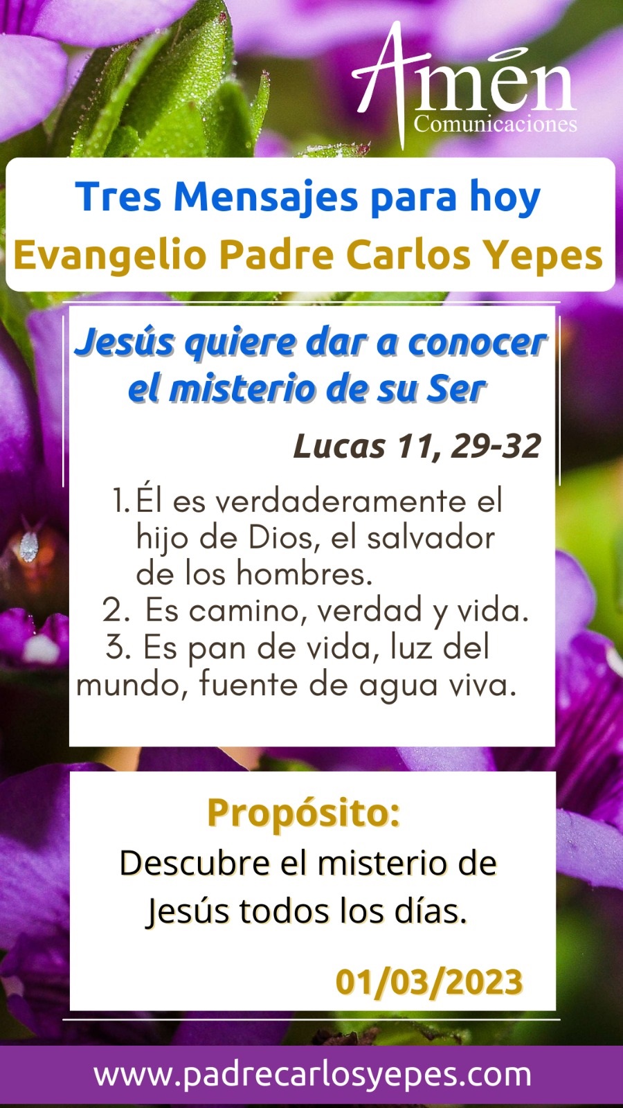 TRANSLITERACIÓN REFLEXIÓN PADRE CARLOS YEPES La fe que pide signos permanentes no es verdadera fe. Los seres humanos somos muy dados a pedir señales, pruebas para poder creer, pero como hemos dicho en otras ocasiones, la dinámica de la fe se mueve en coordenadas diferentes. Hoy Jesús se duele de la generación de su tiempo, porque le pide señales para poder creer en ÉL; la afirmación de Jesús no puede ser más explícita: “Así como el profeta Jonás fue un signo de conversión para los habitantes de Nínive”, y así como la sabiduría proverbial del rey Salomón fue una señal clara para la reina del sur que venía del África y ellos aprendieron fe, nosotros también a partir de estos signos del antiguo testamento, Jonás y el rey Salomón y sobre todo a partir de la palabra de Jesús, estamos llamados a creer. Culminará el evangelio de este día con una afirmación: “Aquí hay uno que es más que Jonás, aquí hay uno que es más que el rey Salomón”. Y es que en verdad Jesús quiere dar a conocer al mundo, el misterio de su ser, no es un hombre más, no es un profeta más, no es un taumaturgo más, es verdaderamente el Hijo de Dios, el Salvador de los hombres, camino verdad y vida, la puerta por dónde pueden entrar las ovejas, el pan de vida eterna, la luz del mundo, la fuente de agua viva, el único capaz de dar salvación, quien a ofrendado su existencia en la cruz derramando su sangre, entregando su vida para el perdón de nuestros pecados y para asumir al recibir la vida del resucitado una nueva forma de relaciones humanas, una nueva forma de justicia universal, una nueva forma de relación religiosa con Dios. El mundo de hoy tan dado al racionalismo, a las pruebas verificables (al llamado discurso científico) debería de admitir que ciertamente la razón y las lógicas humanas son muy importantes, pero la fe es demasiado trascendental para ser encasillada en las razones de los hombres. Los místicos y concretamente san Juan de la cruz nos enseñarán: “Dónde termina la razón comienza la fe”. Y es que el hombre aprende por su lógica racional, aprende por las experiencias vividas y aprende también por la experiencia de la fe, (encuentro profundo de amor con la vida nueva de Dios) que es capaz de renovar y transformar nuestra vida. Hoy Señor te pedimos, ayúdanos a no ser tercos, testarudos, a pedir permanentemente pruebas para poder creer. Dame el regalo de la fe, dame el regalo de descubrir que es un tesoro para el alma (esta virtud teologal) que me encamina a Dios, y que me lleva a mirar los acontecimientos de la vida con los ojos y la mirada de Dios, y por tanto a no desesperarme, a relativizar las dificultades, y a saber que la única certeza que tengo por la fe, es el triunfo de la verdad sobre la mentira, la victoria del bien sobre el mal que se sintetiza de manera definitiva en el triunfo de la vida sobre la muerte, significada en la persona divina de Jesús. Señor Jesús, Hijo del Dios vivo, creo en Ti, dame la hondura de reconocer que en mi alma hay otras dimensiones más allá de las razones lógicas, tecnológicas y científicas para conocer, ayúdame a descubrir que en Ti está el camino para la vida eterna. Que el Señor te bendiga abundantemente en este día, en el nombre del Padre, y del Hijo, y del Espíritu Santo. Amén.