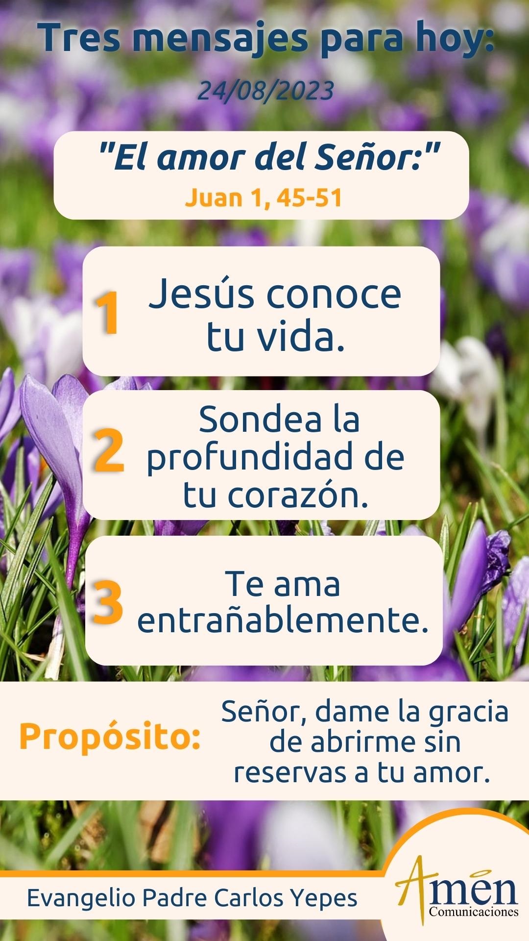 Cuando a veces hay prejuicios en nosotros sobre la religión, sobre el cristianismo, sobre la Iglesia; dejémonos conducir no por los prejuicios que oímos en los medios de comunicación, en profesores de colegio de universidad, en malos amigos, en terceras personas. Vengamos nosotros a conocer a Jesús y veamos con nuestros propios ojos lo que es la experiencia del amor transformante de Jesús por cada uno de nosotros. La palabra del Señor cuando se encuentra con Natanael o Bartolomé (el apóstol que hoy celebramos), no puede ser más clara y no puede ser más emotiva: “Ahí viene un judío, un israelita de verdad, en quien no hay engaño”. Jesús de alguna manera lo declara limpio, puro de corazón; sin embargo, la duda en Natanael o Bartolomé, persiste y afirma: “¿De dónde me conoces?”. Y es aquí donde viene la prueba definitiva que le da Jesús a Natanael: “Desde que estabas bajo la higuera, te vi”. Nos preguntamos con ocasión de esa imagen que le presenta Jesús a Natanael, este muchacho se quebranta, se doblega en su corazón, deja toda duda y hace una profesión de fe en Jesús como hijo de Dios cuando afirma: “Rabí, tú eres el Rey de Israel, tú eres el Hijo de Dios”. Algo tocó muy profundamente la entraña, algo que nunca sabremos sino en el cielo, pero algo ocurrió en la vida de este joven Natanael, que transformó para siempre su corazón. Y cuando Jesús narra de manera tan explícita este episodio debajo de la higuera, conmueve hasta lo más hondo de la entraña al joven Natanael, algo ocurrió que nunca sabremos. Y Jesús nos muestra que Él conoce nuestra vida, que nos sondea en profundidad, que sabe de lo hondo de nuestro corazón y que al descubrirnos lo que es la verdad profunda del hombre, no nos queda sino abrirnos al misterio del amor de Dios y decir: ¡Tú eres el Hijo del Dios vivo!