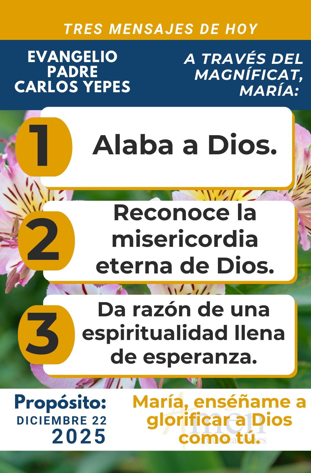 TRANSLITERACIÓN REFLEXIÓN PADRE CARLOS YEPES ¡Magníficat! La primera lectura tomada del Libro de Samuel nos muestra como los versículos precedentes antes del 24, la aflicción de Ana por su esterilidad y su promesa de consagrar a Dios al hijo que Él le diere. Dios le concede el hijo deseado, y nos presenta esta primera lectura, como Ana sube al santuario de Silo para cumplir su compromiso, su voto, su promesa. Samuel, su niño, había sido un don de Dios y a Dios quería devolvérselo. Ana le recordó a Elí, que era el sumo sacerdote en aquel momento, aquella escena de años atrás en que pidió al Señor que se dignara mirar la tristeza, la aflicción de su sierva como madre estéril. Y todo se da para que Ana tenga un hijo, Samuel. Todo ello nos muestra la actuación de Dios en la historia de la salvación, en la historia del pueblo de Israel y modernamente en la historia de la Iglesia. Y quiere puntualizar, quiere patentizar la iniciativa de la salvación, donde Dios elige a ciertos hombres que pueden nacer de madres estériles como Samuel o como Juan el Bautista, o nacer de una Madre Virgen, como es el caso de Jesús. Cómo los grandes personajes de la Biblia se dan a partir de embarazos imposibles, de acciones imposibles para mostrar que toda la obra es de Dios. Con razón el salmo de hoy nos propone, siguiendo el cántico de alabanza de Ana y de gratitud por haber tenido este hijo y consagrarlo en la casa del Señor. Nos invita a unirnos en alabanza con Ana, la madre de Samuel, y decir: “Mi corazón se regocija por el Señor, mi poder se exalta por Dios, mi boca se ríe de mis enemigos, porque gozo con tu salvación. Se rompen los arcos de los valientes mientras los cobardes se ciñen de valor. Los hartos se contratan por el pan, mientras los hambrientos engordan. La mujer estéril da a luz siete hijos, mientras la madre de muchos queda marchita”. Y concluirá este bello texto que utilizamos como respuesta del salmo: “El Señor da la muerte y la vida, hunde en el abismo y levanta, da la pobreza y la riqueza, humilla y enaltece. Levanta del polvo al desvalido, alza de la basura al pobre para hacer que se siente entre príncipes y que herede un trono de gloria”. A partir de esta primera lectura y del salmo que está tomado del texto de primera Samuel capítulo 2, encontramos cómo toda nuestra vida está puesta providencialmente en las manos de Dios. Y como dice bellamente este texto “es el Señor Dios el que da la vida o la muerte, el que hunde en el abismo o levanta, el que da la pobreza o la riqueza, el que humilla o enaltece en la vida”. No te preocupes con tantos esfuerzos personales, no te preocupes con tanto cultivo de tu inteligencia, formación académica y demás. Si uno descubre que el Señor va conduciendo tu vida. Cuántas variables de nuestra existencia nosotros no controlamos. Por ejemplo, no elegimos el lugar donde nacimos, no escogemos el sexo que tenemos masculino o femenino, no elegimos la familia que Dios nos ha dado, no escogimos la inteligencia, las características físicas, morfológicas que tenemos. Hay tantas realidades que son dadas amorosamente por Dios y así las aceptamos. Ana, estéril, clamó a Dios y la bendijo con la maternidad de un gran profeta, Samuel. Y todo, repito a estos grandes personajes de la Biblia, nos muestra que no fue el poder, la fecundidad, la obra de los hombres la que determinó sus vidas, sino el poder y la confianza en la providencia de Dios. Pero pasemos al evangelio de san Lucas en el conocido cántico del Magníficat, que es la expresión más elevada del alma de María a Dios, donde Ella, en estas palabras alaba a Dios porque ha dado una respuesta a las inquietudes de su corazón. Reconoce la misericordia de Dios, misericordia eterna, por lo que realiza en su seno virginal. Es que la Palabra hecha carne se vuelve una palabra profética que destruye y construye, arranca y planta, como dirá Jeremías en el capítulo 1. Y nos presentará el fruto del vientre de María, como el punto de inflexión, el punto final de la historia, donde Jesús es el fuerte que cumple todas las promesas del antiguo testamento, y a María sólo le toca dar su sí a Dios para que la Palabra de Dios se haga carne, se haga hombre, humanidad en su vientre. Pero a partir de este texto reconozcamos tal vez la expresión mariana, el evangelio más hermoso que habla de una espiritualidad de la Santísima Virgen María, una espiritualidad fresca, una espiritualidad actual, una espiritualidad llena de esperanza, una espiritualidad que podríamos llamar “Uno A” porque las características de esta espiritualidad todas empiezan por la letra A. Comencemos. María es la mujer que por la letra A acoge el mensaje del arcángel, la voluntad de Dios. Y hoy se nos invita a ejemplo de María, a acoger el mandamiento de Dios, el mandamiento del amor, del perdón y de la entrega de la propia vida. Pero, además, María, por la letra A se admira, se asombra con lo que Dios, en su proyecto providente realiza en su vida. Ella sería una simple mujer perteneciente a la clase socioreligiosa de los anawim. Y, sin embargo, el Señor, la ha mirado, la ha elegido portentosamente, por eso Ella se admira y se asombra. Nos puede pasar también a ti y a mí, donde podemos preguntarle a Dios ¿por qué me has elegido, si hay tantas personas más buenas, más santas, mejores que yo? Y simplemente reconocemos que la elección del Señor es gratuita, es por pura liberalidad. Pero en una tercera palabra encontramos que María es la mujer de la alegría que se alegra su espíritu en Dios, que envía al Salvador a través de su vientre. Hoy descubramos que una espiritualidad mariana auténtica nos lleva a vivir en alegría, en gozo, en esperanza, sabiendo que Dios no abandona, que siempre acompaña, la tristeza fuera. Y recordamos la expresión del apóstol Pablo: “Estén alegres en el Señor, os lo repito estén alegres en el Señor”. O como decían los santos, re