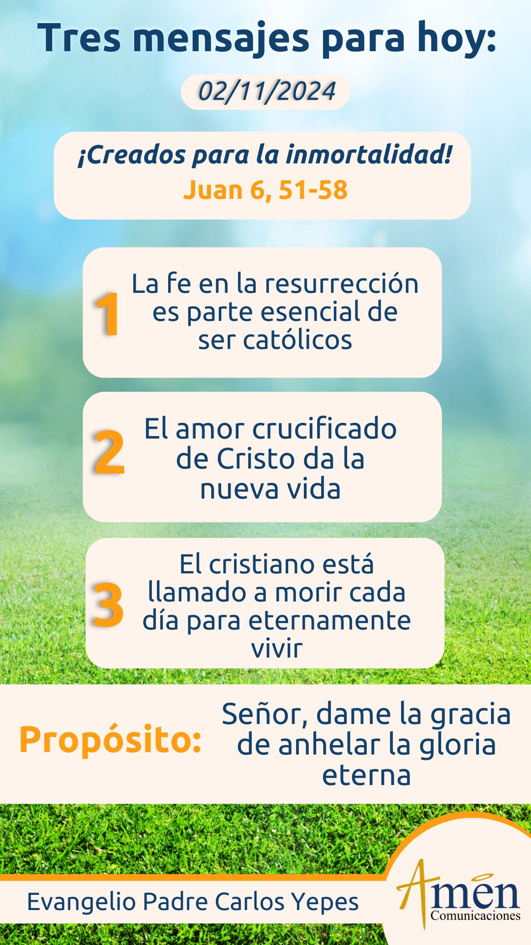 Inmediatamente después de la fiesta de Todos los Santos, donde se da gloria a Dios con la vida de estos gigantes, héroes de la fe, la esperanza y el amor; la Iglesia conmemora a aquellos fieles difuntos que, en un estado de purificación, peregrinan hacia la casa del Padre, hacia la patria celestial. Pero, ¿qué podremos decir cuando en un día como estos, 2 de noviembre, hay tantos sentimientos en nuestro corazón sobre el misterio mismo de la muerte? Podremos de entrada afirmar: “Que Dios no ha creado al hombre para la muerte, sino para la inmortalidad”, según nos dice el Libro de la Sabiduría en el capítulo 2, versículo 23: “En el corazón humano hay una doble sed, una sed de Dios, de su amor y una sed de eternidad, de infinito, de inmortalidad”. Pero nos dirá a renglón seguido el Libro de la Sabiduría en el capítulo 2, versículo 24: “Que la muerte, esa realidad dolorosa que ha entrado en el mundo y en la vida de los hombres, se da por la envidia del diablo y a través del pecado entra la muerte en el mundo”. Conocemos como nadie la experiencia sensible de la muerte: por la violencia, por la enfermedad, por la vejez se llega al término, al final de la vida. Pero también descubrimos nosotros que hay cierta cultura morbosa y amarillista sobre el tema de la muerte, se escandaliza en los noticieros de televisión, por ejemplo, en los titulares, se hace morbo con la muerte. Nuestros noticieros se deberían de llamar noticieros A, porque sus noticias todas empiezan por la letra A: abaleado, atropellado, apuñalado, accidentado, asesinado, agredido con ácido, se hace morbo de la muerte y en el fondo nosotros no reconocemos de alguna manera, como esa luz más profunda que hay más allá de la muerte. Lo diré en palabras muy sencillas, estamos muy vivos para la muerte, pero muy muertos para la vida, somos muy conscientes y nos escandalizamos del final, el término de esta vida terrenal; pero somos muy poco conscientes y muy poco claros de lo que es la luz que nos espera, la gloria definitiva en el cielo, más allá de nuestra muerte que es un umbral hacia la vida definitiva.