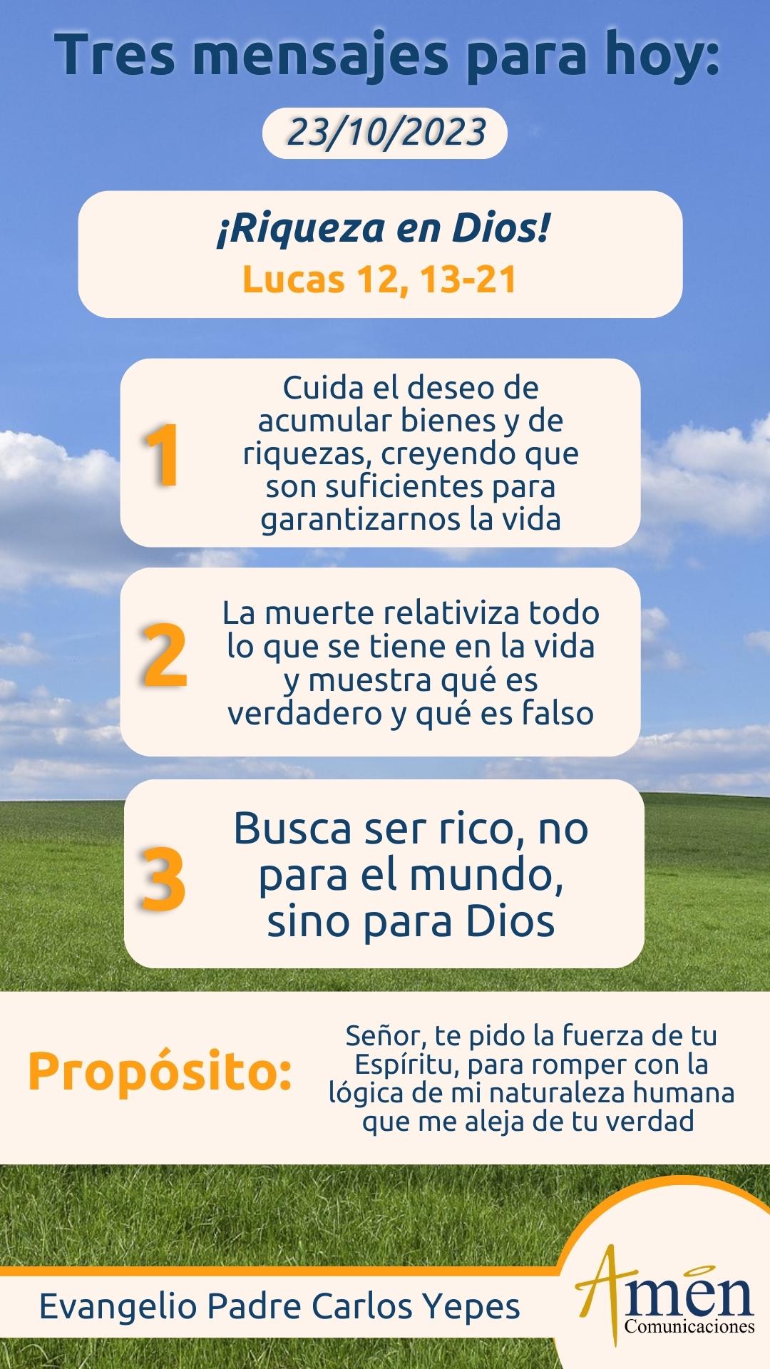 Una tercera enseñanza, y quizás la más importante de todas, es la de buscar con sabiduría ser ricos no para el mundo, ser ricos para Dios. Jesús nos invita a no atesorar riquezas para sí, sino enriquecernos para Dios. Pero nos preguntamos ¿cuál es ese camino para ser ricos ante Dios?, y reconocemos expresiones lapidarias de Jesucristo, que nos invitan a romper la lógica humana del atesorar. Por ejemplo, Mateo 20 – 27, nos habla de: “Quien quiera ser el primero que se haga el último”. Hechos de los Apóstoles 20 – 35, nos invita a descubrir, que: “Hay más alegría en dar antes que en recibir”, Mateo 18 – 4, nos invita a descubrir que: “El mayor entre los hombres es el que se hace humilde, y el menor entre todos”. Finalmente descubrimos con Mateo 10 - 39 que: “Solo salva su vida aquel que la pierde”.