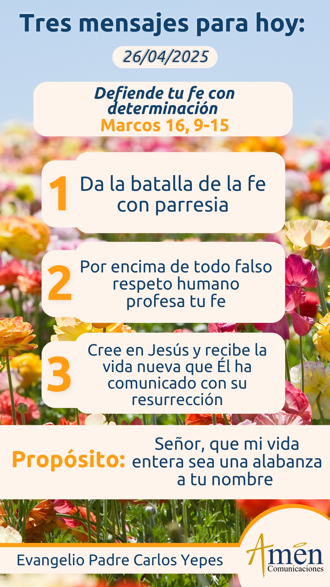Hoy, en tu vida y en la mía, así como hay pasión hablando de fútbol, hablando de política, hablando del cambio climático y la defensa del planeta, hablando de las guerras en otros países, así como hay tanta pasión por temas puramente humanos; cómo no hay pasión, fuego abrasador en tu corazón para anunciar la vida nueva que Jesús te ha dado, más allá de que el mundo implícitamente te humíllate o te desprecie o te margine por hablar de Jesús y mostrarte como un hombre, como una mujer religiosos. Esta batalla de la fe ya no se da solamente en Hechos de los Apóstoles, la primera lectura, sino en Marcos, cuando Jesús Resucitado, al amanecer del primer día de la semana a María Magdalena, va a comunicar a los suyos la aparición que estaban llenos de dolor y llenos de lágrimas, pero ellos no creen el mensaje de Magdalena. Otro tanto ocurre a dos de los apóstoles que, caminando en el campo, van también a comunicar a los suyos que Jesús ha resucitado, pero nuevamente no les creen, no les creen, y es sólo cuando Jesús ya no a través de dos campesinos o de Magdalena, sino de manera presencial y directa, se aparece al grupo de los 11, es cuando Él les echa primero en cara su incredulidad, la dureza de su corazón, porque no han creído, y es sólo cuando ellos creen y reciben el mandato evangélico: “Vayan al mundo entero, vayan a toda persona con todo el poder de Dios y proclamen el evangelio a toda la creación”.