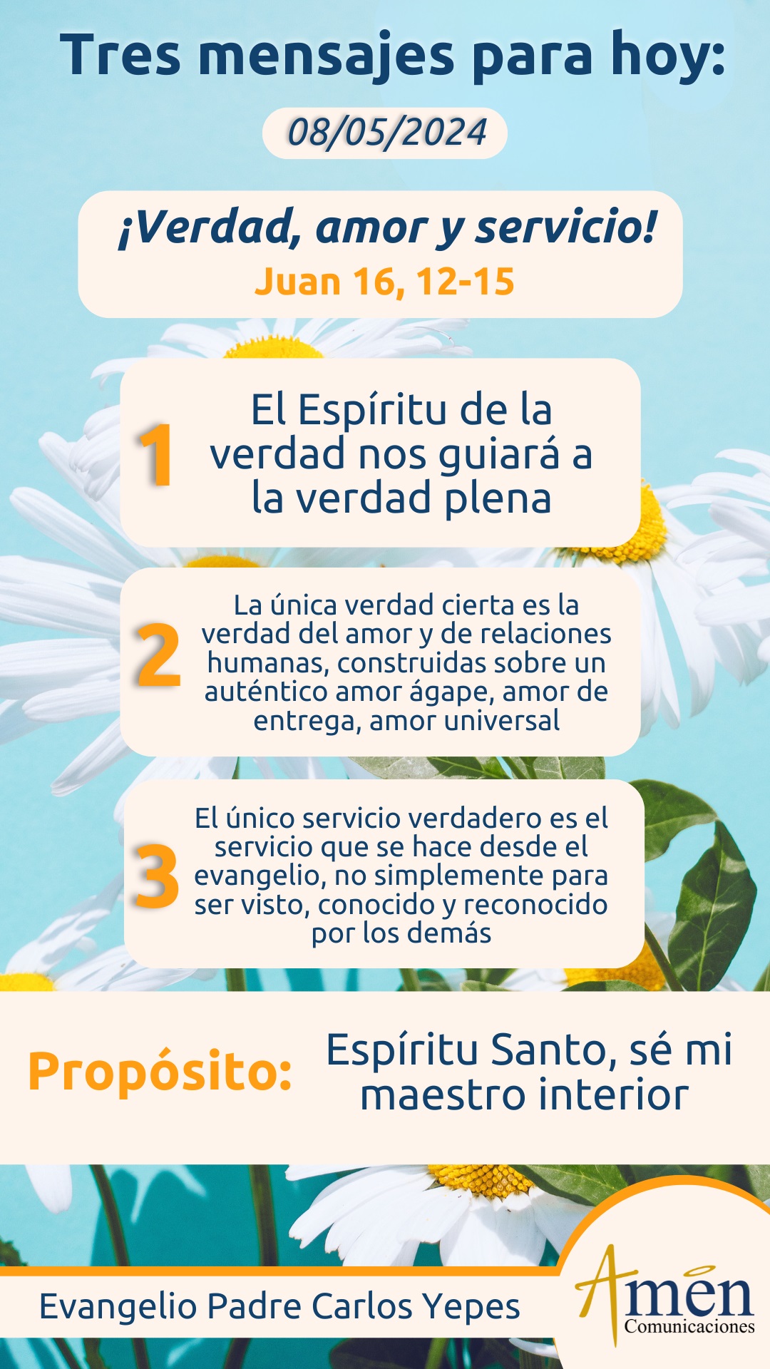 Pero en una segunda enseñanza del evangelio de hoy, nos muestra como el Espíritu de la verdad nos guiará a la verdad plena. En el mundo, y los años y el de curso de la vida nos lo van mostrando, el mundo es un gran engaño, amistades del mundo son engañosas; posesiones sociales, reconocimientos públicos del mundo son engañosos, adulaciones y alabanzas del mundo son engañosos, aplausos y admiraciones del mundo son engañosas. La única verdad cierta es la verdad del amor y de relaciones humanas, construidas sobre un auténtico amor ágape, amor de entrega, amor universal. El único servicio verdadero es el servicio que se hace desde el evangelio, no simplemente para ser visto, conocido y reconocido por los demás, para ser mirado y admirado por los otros. Sólo se ama y se sirve de verdad, cuando se hace desde la perspectiva de Jesús y como Él nos lo enseñó en el evangelio.