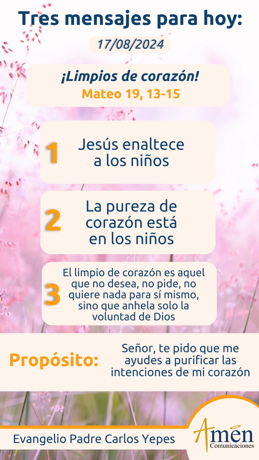Pero hoy, a propósito de este evangelio en una tercera enseñanza, nos preguntamos, ¿quién es el limpio de corazón?, recordando la bienaventuranza del evangelista san Mateo cuando afirma: “Dichosos los limpios de corazón, porque ellos verán a Dios”, y podríamos responder, que el limpio de corazón, es aquel que no desea, no pide, no quiere nada para sí mismo, porque está vacío y vaciado de sí mismo. Por el contrario, el que desea, pide y quiere, sólo lo que quiere, desea y pide a Dios para él. Esto es demasiado importante y nos pone a pensar a cada uno de nosotros, si en verdad somos limpios de corazón, porque en nuestro interior estamos llenos de peticiones, de quereres, de deseos y caprichos personales, que no son necesariamente las peticiones, los quereres y los deseos de Dios. Sólo es limpio lo repetimos, aquel que desea, pide y quiere, lo que Dios desea, pide y quiere para él. Por eso en el limpio de corazón no hay miedo, no hay ansiedad, no hay frustración, porque todo lo que hay en su vida y reconoce que todo lo que acontece y lo que ocurre en su vida, es para su bien, porque Dios lo ha dispuesto así.