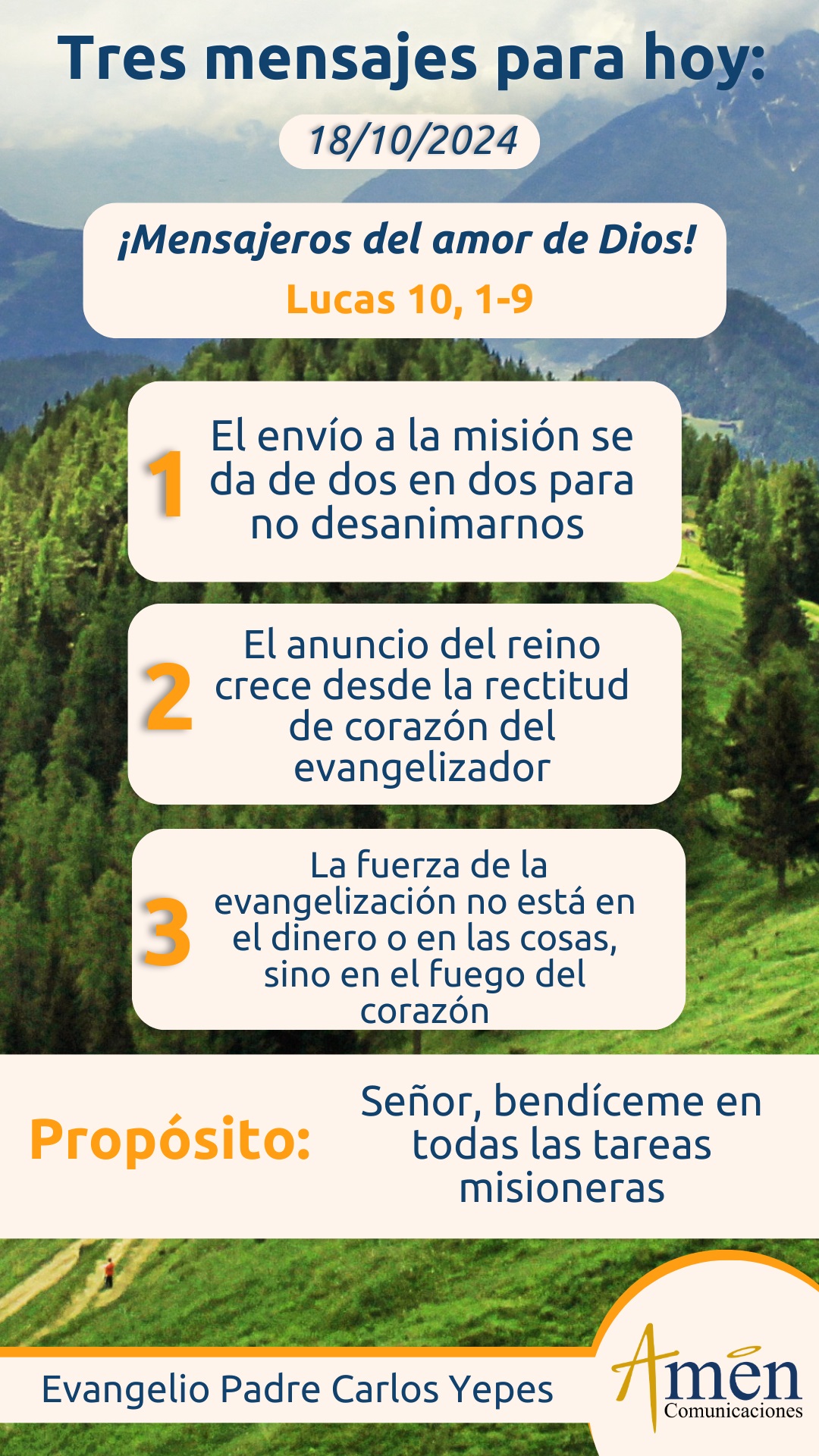 La mies es abundante y los obreros pocos; rogad, pues, al dueño de la mies que mande obreros a su mies. ¡Poneos en camino! Mirad que os mando como corderos en medio de lobos.