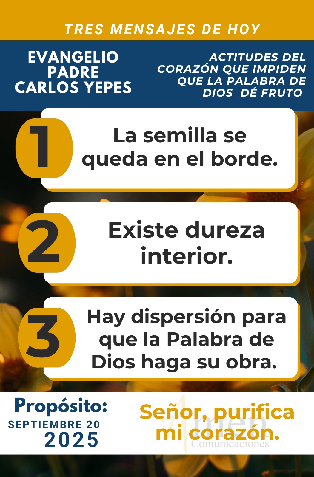 Pero nos presenta la parábola tres expresiones del corazón humano, tres disposiciones de nuestra alma interior cuando recibimos la potencia de la Palabra de Dios, que también necesita de la buena disposición de nuestro corazón a la manera de un campo, de una sementera.