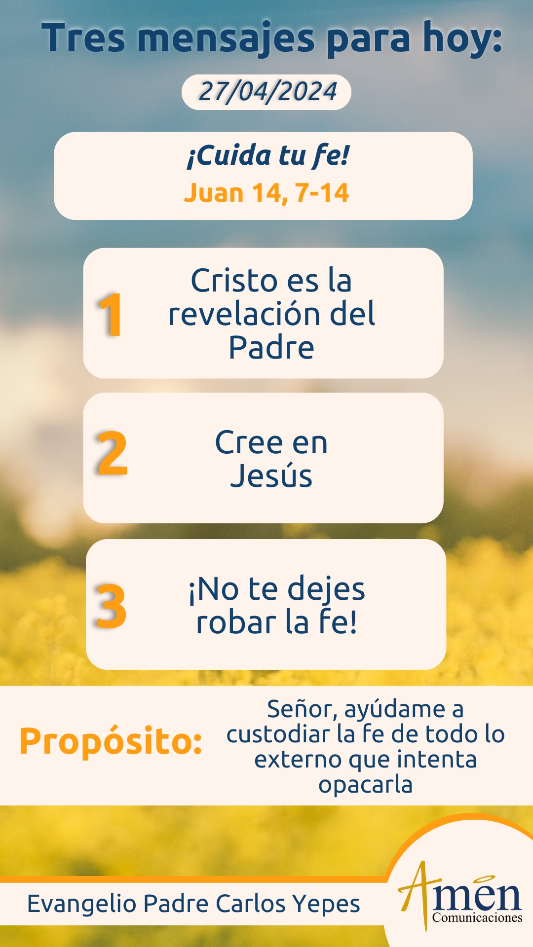 Pero avanzando en esta reflexión, encontramos algo que nos pone a pensar, cuando Jesús de manera autoritativa dirá a los suyos: “En verdad, en verdad les digo”, y esta afirmación precede simplemente una enseñanza con autoridad, y dirá Jesús: “El que cree en mí, también Él hará las obras que yo hago y aún mayores, porque yo me voy al Padre”. Detengámonos en esta afirmación y pensemos, si nuestra fe fuera cierta, madura, sólida en la persona de Jesús, haríamos las mismas obras de sanación, de liberación, de transformación, de renovación, no sólo en nuestra vida, sino en la vida de nuestros cercanos, por ejemplo, en nuestra familia. Lo promete Jesús y lo dice de manera autoritativa, esto es, con autoridad: “En verdad, en verdad les digo, el que cree en mí, también él hará las obras que yo hago, y aún mayores que yo”. Increíble, la fe es el gran poder por medio del cual, nosotros podemos ayudar a la transformación del mundo. Pero pensamos en otro pasaje evangélico que ciertamente no se lee hoy, en el que Jesús, viendo la falta de fe de los suyos dice en aquel pueblo: “No pude hacer muchos más milagros, porque les faltaba fe”. También recordamos otro pasaje evangélico cuando nos dice Jesús: “Cuando venga el Hijo del Hombre, por segunda vez y definitiva al final de la historia, ¿todavía encontrará fe en este mundo?”. Lo que era hierba silvestre, cosecha permanente en la generación de nuestros padres y abuelos, la fe que se daba natural; hoy por la tecnología, por la racionalidad, por los discursos que escuchamos sobre todo en redes sociales, en conversaciones a veces prevenidas, nos hemos debilitado en la fe en el Señor, en la fe en la Iglesia fundada por el Señor, ¡No te dejes robar la fe! En mi ciudad de Medellín hablamos de robar a alguien por cosquilleo y esto es sacarle su teléfono móvil o celular, sacarle su billetera sin que la persona se dé cuenta de ello, se percate de ello; así es la fe que se pierde por cosquilleo, gente buena que no se da cuenta que una serie de televisión, la tecnología que te atrapa en mil mensajes, la conversación a veces de gente ignorante que se las da de ilustrada, te pueden robar la fe en Jesús y en su Iglesia sin darte cuenta por cosquilleo. Hoy muchísimas personas que dicen no creer, ante la pregunta concreta: ¿qué te ha hecho Dios?, ¿qué te ha hecho la Iglesia para que digas que no crees?, siempre recurren a espacios comunes: no me ha hecho nada, pero he oído decir esto, he escuchado lo otro, he visto este documental que dice tal cosa, y yo siempre les pregunto, y ¿has cuestionado cuál es el portal o el noticiero o los dueños de ese canal que hablan en contra de la iglesia?, ¿piensas que esto es gratuito?, ¿piensas que no obedece a una agenda ideológica, trabajada, calculada, meditada, para que tú precisamente pierdas la fe?, ¿piensas que estás seguidilla de escándalos uno tras otro, más allá de que puede haber pecado en la Iglesia y lo hay, en el fondo es un magnificar, agrandar, escandalizar tu fe para desanimarte?, ¿acaso no caes en la cuenta que detrás de lo que san Juan llama la mentalidad del mundo hay una hostilidad contra la fe cristiana y buscan deslegitimar, desacreditar, destruir tu fe?. No podemos ser tan ingenuos, nada es gratuito en la vida, nada es gratuito; detrás de una noticia hay un editor, hay un dueño de un programa, hay unos intereses económicos, hay una agenda ideológica, donde siempre hay un veneno contra personas, contra instituciones y concretamente hay una malicia para dañar y deslegitimar la Iglesia. No peques por ingenuo, que el Señor hoy te dice que, si tienes fe, si no te la dejas robar, harás las obras, los milagros del Hijo y aún mayores, y culminará diciendo: “Que lo que pidan se les dará, para que sea glorificado el Padre de los cielos”.